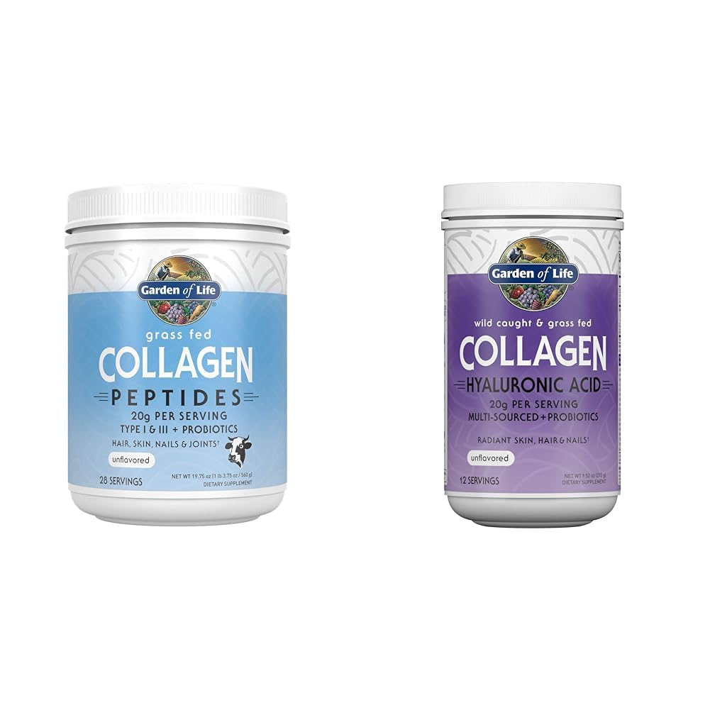 This collagen peptide bundle includes 28 servings of Garden of Life's unflavored grass-fed bovine collagen peptides powder and 12 servings of their marine and grass-fed collagen peptides powder with hyaluronic acid. The unflavored powder provides 20g of type I and III collagen peptides and 18g protein per serving to support skin, hair, nail, joint, and gut health. It mixes easily into liquids and foods. The marine and grass-fed formula uniquely combines peptides from grass-fed bovine (20g per serving) and sustainably-sourced marine sources along with 120mg hyaluronic acid and probiotics. This multi-sourced collagen was designed to provide structural support for skin elasticity, healthy hair and nails, joint mobility, and gut health. Both collagen peptide formulas feature clean, sustainable ingredients and are third-party tested to be non-GMO, gluten-free, keto, and paleo. This bundle offers two high-quality collagen supplements that work synergistically to support whole body wellness, allowing you to experience the benefits of bovine and marine collagen as well as hyaluronic acid.