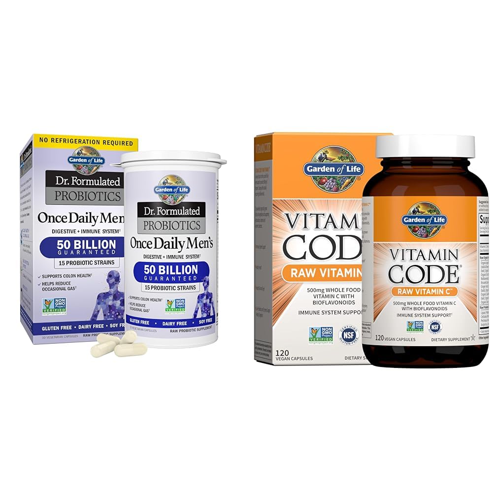 This bundle combines Garden of Life's probiotics and vitamin C supplements to support men's digestive and immune health. The probiotics provide 50 billion CFU across 15 strains of bacteria, including Lactobacilli and Bifidobacteria, studied for benefits like digestive regularity, gas relief, and colon health. It also contains prebiotic fiber to promote probiotic growth. The vitamin C supplies 500mg per serving from 23 organically grown whole foods, plus antioxidants and nutrients to support immunity, heart health, skin, eyes, and tissue repair. Together, these components offer a comprehensive approach to a man's wellbeing. The probiotics populate the gut microbiome, while the vitamin C strengthens the immune response. Their combined antioxidant effects help fight free radicals and oxidative stress. For convenience, the probiotics come in once-daily capsules, and the vitamin C in easy-to-swallow vegan capsules. Both are third-party certified non-GMO, gluten-free and made in the USA without artificial ingredients. This bundle allows men to address both digestive balance and immune defense in complementary daily supplements expertly formulated for their needs.