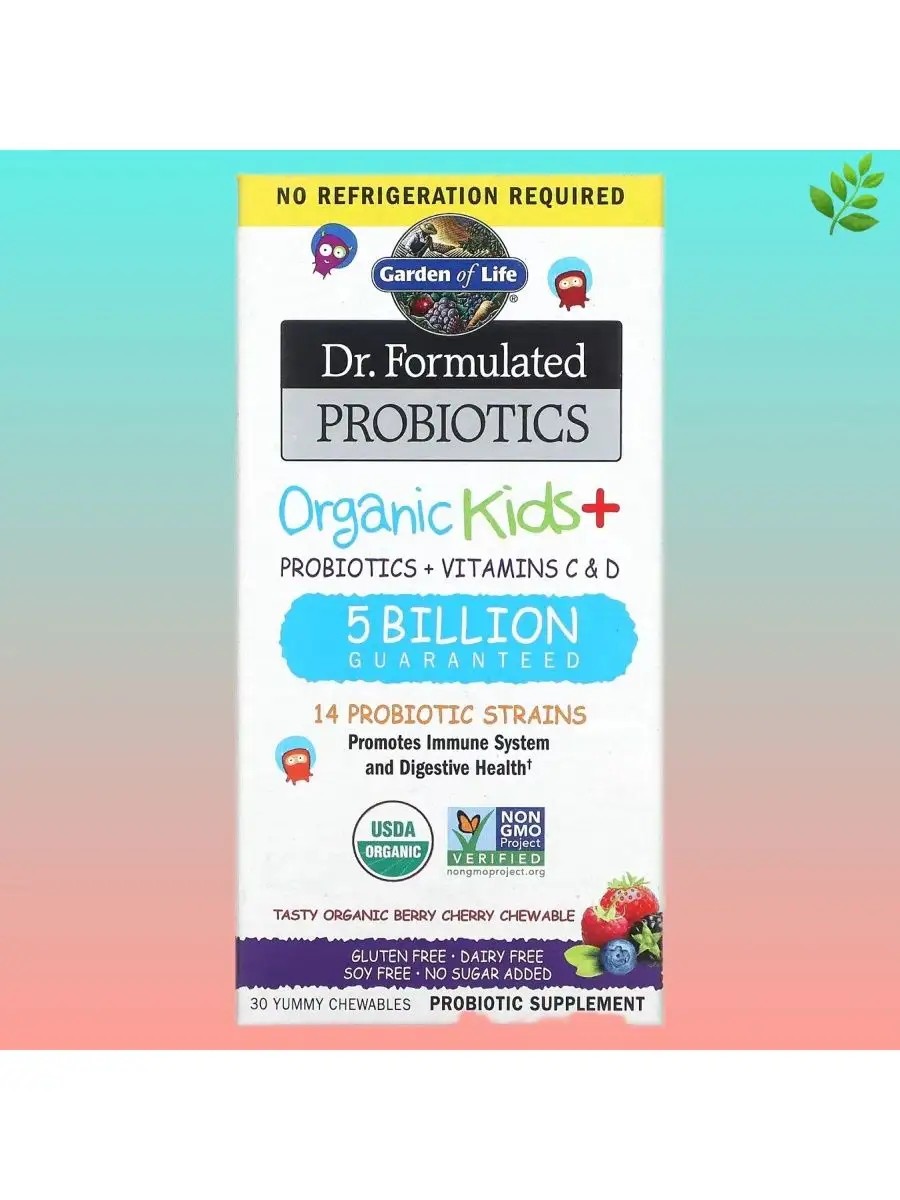 Garden of Life, Dr. Formulated Probiotics, Organic Kids+, Organic Strawberry Banana Flavor, 30 Delicious Chewable Tablets. Probiotics, Vitamins C and D. Guaranteed potency with a long shelf life: New desiccant bottle technology preserves probiotic potency. No refrigeration required. 14 probiotic strains. Promotes a strong immune system and digestive health. USDA Organic. Non-GMO Project Verified. Certified Gluten Free by NSF.