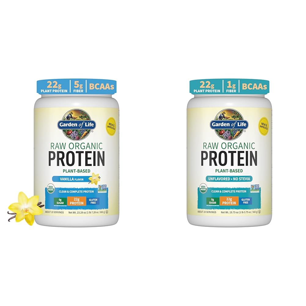 This protein powder bundle includes two sizes of Garden of Life's Raw Organic Protein powder to help rebuild muscles and aid recovery. The vanilla-flavored 1.5 pound container provides 22g of complete plant-based protein and 4g BCAAs per 130 calorie serving. It also contains 5g fiber and digestive enzymes and probiotics. The unflavored 1.2 pound container likewise has 22g complete protein and 4g BCAAs per 120 calorie serving, with 1g fiber and digestive enzymes and probiotics. Both feature improved texture and mixability. Their protein comes from organic plant sources like peas, sprouted grains and seeds which deliver vitamins and minerals with 1g net carbs per serving. As non-GMO, certified organic, kosher and vegan protein powders made at low temperatures, these products provide clean nutrition. The vanilla flavor adds a delicious taste while the unflavored allows customization. Together these complementary powders supply essential amino acids and digestion-supporting compounds to build lean muscle and hasten post-workout recovery.
