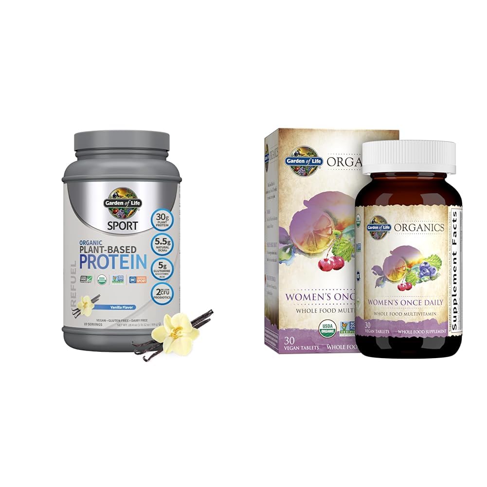This bundle pairs two high-quality supplements from Garden of Life to support an active, healthy lifestyle. The Organic Vegan Sport Protein Powder provides 30g of plant-based protein per serving to help repair muscles and speed recovery after workouts. It contains probiotics, tart cherries, and other organic superfoods to support immunity and wellbeing. The protein powder is certified USDA Organic, Non-GMO Project Verified, NSF Certified for Sport, and Informed-Choice Certified, ensuring it meets stringent standards for quality and purity. The Garden of Life Organics Women's Once Daily supplement complements the protein powder by offering a whole food multivitamin formulated specifically for women's needs. It is made from over 30 organically grown fruits, vegetables, and herbs to provide 15 vitamins and minerals, including iron, biotin, vitamin D3, B vitamins, and vitamin C. This once-daily tablet promotes energy, metabolism, heart health, and healthy skin and nails. Like the protein powder, the multivitamin is Certified USDA Organic and Non-GMO Project Verified. Together, these two Garden of Life products offer a convenient way to meet protein needs after workouts while also getting essential vitamins and minerals from high-quality, organic sources. The combination supports an active lifestyle focused on health, wellness, and peak performance.