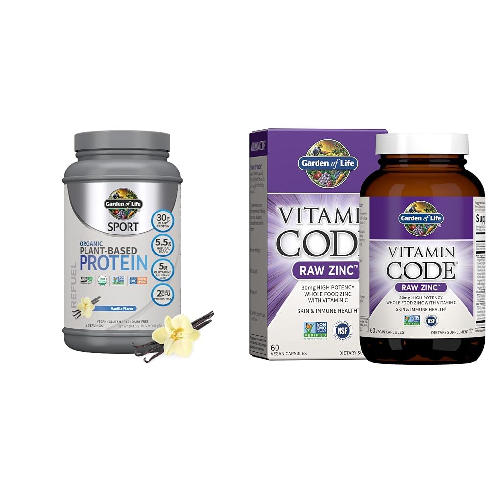 Organic Vegan Sport Protein Powder, Vanilla - Probiotics, BCAAs, 30g Plant Protein for Premium Post Workout Recovery - NSF Certified, Keto, Gluten Dairy Free, Non GMO - Garden of Life - 19 Servings Organic Plant-Based Protein offers a blend of certified organic proteins from multiple sources, featuring U.S. grown organic peas, to give it a great smooth and creamy texture. The Organic Muscle Recovery Blend includes Organic Tart Cherries, Organic Apples, Organic Turmeric, Organic Gogi berries and Organic Blueberries-these antioxidants are known to promote faster recovery. Because many sports participants compromise their immune systems due to intense training programs, we added a specially-selected, clinically studied probiotic that has been shown to support immune health during intensive workouts. Organic Plant-Based Protein is the cleanest protein available having quadruple, third-party certifications saying so. Not only is it Certified USDA Organic and Non-GMO Project Verified, Organic Plant-Based Protein takes it to the next level for sport by being NSF Certified for Sport and Informed-Choice for Sport Certified. This ensures there are no banned athletic substances-just whole clean nutrients. Garden of Life Zinc Supplements 30mg High Potency Raw Zinc and Vitamin C Multimineral Supplement, Vitamin Code Trace Minerals Probiotics for Skin Health Immune Support (Packaging may vary) Go beyond vitamins and minerals with Vitamin Code Raw Zinc Formula, providing Raw Food-Created Nutrients to support immune system function, healthy wound recovery and DNA synthesis, plus skin, eye and prostate health. By Garden of Life.Product 2: ZINC FOR SKIN HEALTH PLUS PROBIOTICS ENZYMES: Our plant based chelated Zinc vitamin includes a Raw Probiotic and Enzyme blend for added digestive support You can also open the capsules and mix the contents with water or juice, if you wish. Product 2: WHY RAW ZINC: Raw means these Zinc pills are made without high heat, and they contain no synthetic or filler ingredients - Just Raw, food created nutrients for immune system support, skin health and eye health, as well as prostate health. Product 2: NATURAL COFACTORS: Raw Organic fruits vegetables, alkalizing trace minerals and probiotics enzymes add additional antioxidants, vitamins and cofactors to our Vitamin Code Vegan Zinc formula, enabling the natural recognition of nutrients by your body. Product 2: ZINC WITH VITAMIN C FOR IMMUNE HEALTH: Our Zinc supplement provides whole food nutrition with 30mg of elemental Zinc (over 250 of the new daily value) plus 60mg of raw vitamin C, both in a whole food form for optimal nutrient absorption and utilization. Product 1: Immune system support: This BCAAs amino acid powder contains 2 billion CFU probiotic blend to keep your immune system strong during training. Product 1: Recovery drinks: This sport protein powder promotes faster recovery with an organic high antioxidant blend of organic tart cherries, organic apples, organic turmeric, organic gogi berries and organic blueberries. Product 1: Post workout recovery: Our Garden of Life Vegan Protein helps you refuel repair muscles after a hard workout with 30 grams of complete protein and over 5 grams BCAA amino acids, glutamine glutamic acid. Product 1: Organic sport protein: Certified USDA organic, Non-GMO project verified, NSF certified for sport, informed choice for sport certified, vegan, gluten free, dairy free, soy free, no added sugars.