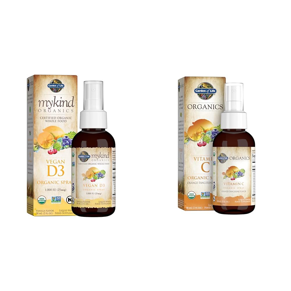 This vitamin bundle pairs Garden of Life's mykind Organics Vegan Vitamin D3 with their mykind Organics Vitamin C to provide immune support and promote health. The Vitamin D3 is an organic, vegan spray made from lichen instead of lanolin. Each spray delivers 1000 IU of Vitamin D3 which aids calcium absorption for bone health and supports immune function. It also contains omega-3s from organic pumpkin and cranberry seed oils. The Vitamin C is also USDA organic and delivers 60mg of vitamin C per serving from whole foods like organic amla berry. With bioflavonoids for absorption, it promotes immune health, tissue repair, and skin health. The orange tangerine flavor contains no added sugars. Together, these complementary vitamin supplements provide certified organic, vegan-friendly immune support for adults and kids. The vitamin D3 aids absorption of immune-boosting vitamin C. And the antioxidant vitamin C protects cells from damage while helping utilize calcium absorbed thanks to vitamin D3. The liquid sprays are easy to take, full of whole food ingredients, and free of gluten, GMOs, and synthetic ingredients.
