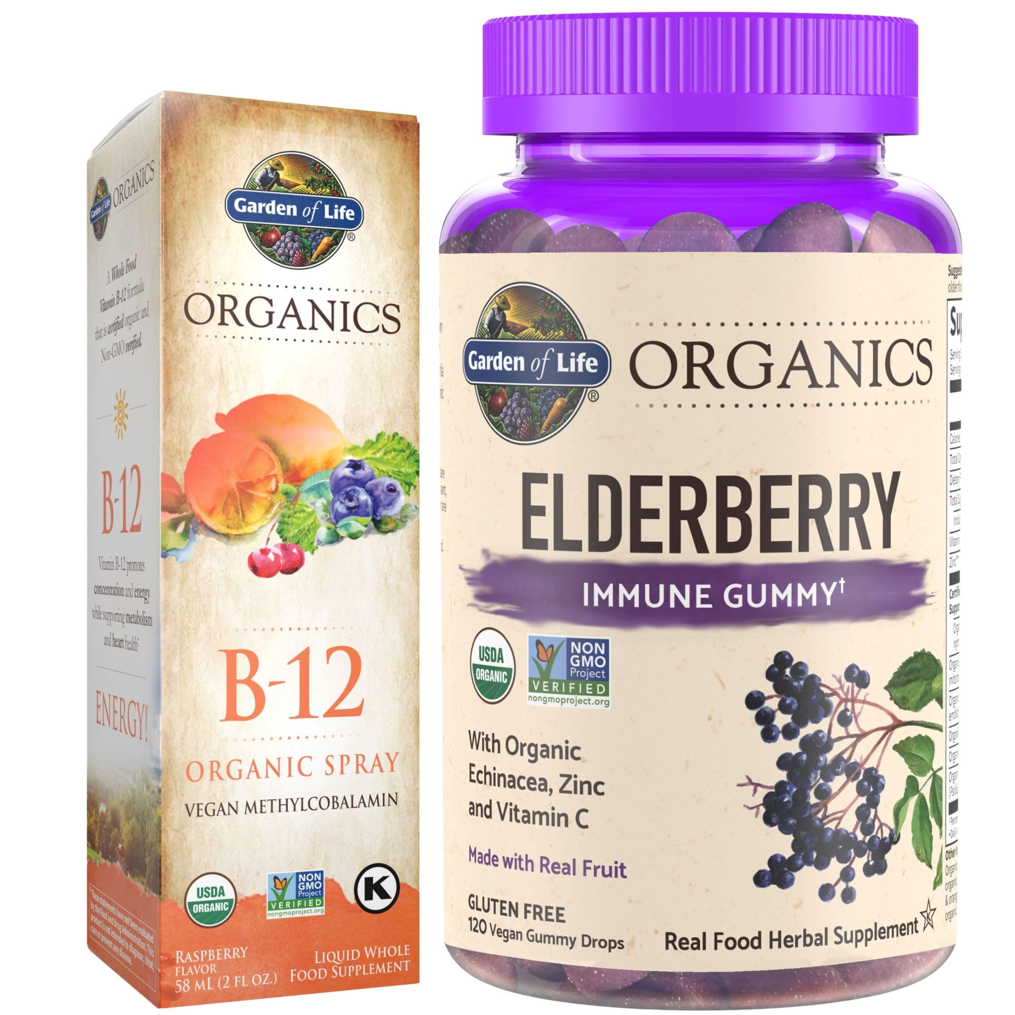 The elderberry gummies are sweetened only with fruit with no added sugar or oils and are Third-party Certified USDA Organic and Kosher. The B12 spray is made from real, nutritious foods and is Certified USDA Organic, Non-GMO Project Verified and Vegan. The elderberry gummies contain an expertly crafted blend of antioxidant-rich berries, roots and leaves with no synthetic vitamins or artificial ingredients. Enjoy a delicious raspberry-flavored B12 spray with 500mcg methylcobalamin per serving to support energy, metabolism and heart health. Get year-round immune support with Organic Black Elderberry extract combined with whole food vitamins and minerals like Zinc from Organic Guava in convenient gummies.