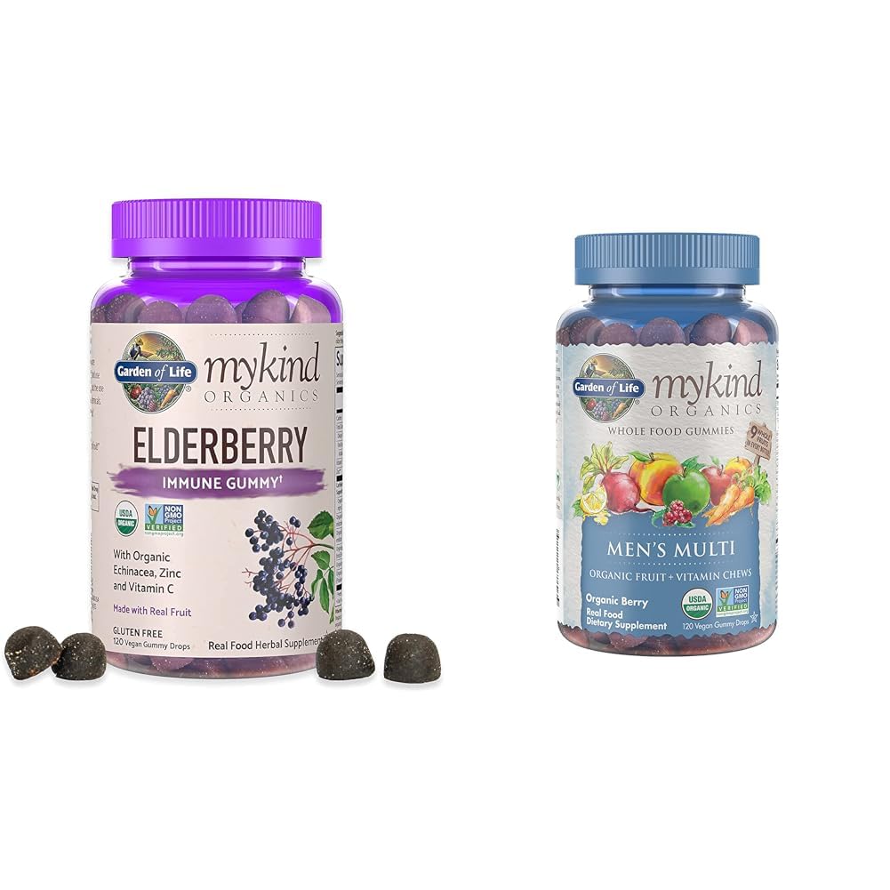 Garden of Life Organics Elderberry Gummies for Adults Kids - Immune Support Supplement with Organic Fruit, Herbal Blend, Elderberry, Echinacea, Zinc, Vitamin C, 120 Vegan Gluten Free Gummies Even the strongest immune system can succumb periodically to seasonal challenges, this is why an immune support supplement is key for overall health.† We have all heard of elderberry lozenges and elderberry syrup because Elderberries are packed with beneficial nutrients including their high antioxidant power and their large array of flavonoids.† But our Sambucus Elderberry gummies are a little bit different. At Garden of Life, we strive to stay true to clean extraction methods and whole, organic ingredients in our products. This is why we are proud to introduce our Organic Elderberry Immune gummies. These are not just your ordinary adult gummy vitamins children will love these yummy gummies too! Made from only whole, organic fruit and herbs, these expertly formulated immune support vitamins are perfect for those who lean towards clean vegan vitamins or follow a plant based diet. Organic Black Elderberry (Sambucus nigra L.) has been clinically studied for seasonal immunity.† Aronia berry, a powerful plant based antioxidant, is a traditional Native American remedy for colds.† Organic Amla Berry delivers vitamin C and bioflavonoids in a form the body can digest and use.† The Organic Zinc vitamin is derived from Guava leaves and fruit.† We combined these powerhouse ingredients along with traditional herbs such as Organic Echinacea purpurea root and Organic Rosemary, for a powerful 100 plant based Immune Gummy.† Immune support never tasted so good.† Garden of Life Organics Men's Gummy Vitamins Multi Berry, 120 Count Garden of Life Organics Men's Multi Gummies are Certified USDA Organic and Non-GMO Verified fruit and vitamin gummies. Made with nine organic whole fruits in every bottle—no synthetic vitamins—our Men's Multi Gummies contain no candy ingredients, no artificial flavors or colors and come in a great-tasting organic berry chew made with pectin from organic apples and organic orange pee—no pig gelatin. Made with only whole food ingredients, Organics Men's Multi Gummies have targeted ingredients to support the needs of men including vitamin E and folate and 800IU of Vegan D3.Product 2: ORGANIC GUMMY VITAMIN: Certified USDA Organic and Non-GMO Project Verified, Certified Vegan, Certified Gluten Free and Kosher, No artificial flavors or colorings. Product 2: MEN-SPECIFIC: This gummy multivitamin for men has targeted ingredients to support the needs of men including vitamin E and folate, and 800IU of Vegan D3 vitamin.Store in a cool, dry place. Product 2: UNPROCESSED: With our clean gummy technology, these men's multivitamin gummies have no "candy" ingredients, no pig gelatin, and no corn starch. Product 2: ADULT VITAMIN GUMMIES: These organic gummy vitamins for men have 9 organic whole fruits in every bottle. Product 1: EXPERTLY CRAFTED HERBAL SUPPLEMENTS - Our Organic Elderberry gummies are expertly formulated with daily whole food immunity vitamins, fruits, veggies and botanicals and no filler or candy ingredients for a naturally sweet taste adults and kids love. Product 1: DELICIOUSLY SIMPLE GUMMIES - No need to sugarcoat when fruit tastes so great. Our yummy vegan gummies are dusted with Organic rice meal sunflower oil and sweetened only with fruit (no sugar or hydrogenated vegetable oils) so you only get what you need. Product 1: WHOLE FOOD NUTRITION - Reap the benefits with Zinc and Vitamin C sourced from real foods whole fruits, roots and leaves. We use an Organic Immune Support Blend of berries, Echinacea, Rosemary and Guava with no synthetic vitamins or artificial ingredients. Product 1: YEAR-ROUND IMMUNITY SUPPORT - Our Elderberry gummy combines antioxidant-rich Organic Black Elderberry extract from the plant Sambucus, with whole food vitamins and minerals, such as Zinc from Organic Guava providing natural year round immune support.