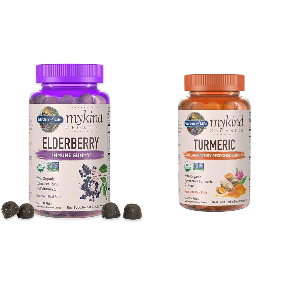 Garden of Life Organics Turmeric Inflammatory Response Gummy - 120 Real Fruit Gummies for Kids Adults, 50Mg Curcumin (95 Curcuminoids), No Added Sugar, Organic, Non-GMO, Vegan Gluten Free Made with Organic Fermented Turmeric Ginger, Garden of Life Organics Turmeric Inflammatory Response Gummy† is made with Certified USDA Organic and Non-GMO Project Verified real fruit—no animal gelatin or refined sugars—just real fruit! Our ingredients are sourced from sustainable organic farms and use an Organic, Non-GMO extraction method without the use of corn alcohol. Garden of Life Organics Elderberry Gummies for Adults Kids - Immune Support Supplement with Organic Fruit, Herbal Blend, Elderberry, Echinacea, Zinc, Vitamin C, 120 Vegan Gluten Free Gummies Even the strongest immune system can succumb periodically to seasonal challenges, this is why an immune support supplement is key for overall health.† We have all heard of elderberry lozenges and elderberry syrup because Elderberries are packed with beneficial nutrients including their high antioxidant power and their large array of flavonoids.† But our Sambucus Elderberry gummies are a little bit different. At Garden of Life, we strive to stay true to clean extraction methods and whole, organic ingredients in our products. This is why we are proud to introduce our Organic Elderberry Immune gummies. These are not just your ordinary adult gummy vitamins children will love these yummy gummies too! Made from only whole, organic fruit and herbs, these expertly formulated immune support vitamins are perfect for those who lean towards clean vegan vitamins or follow a plant based diet. Organic Black Elderberry (Sambucus nigra L.) has been clinically studied for seasonal immunity.† Aronia berry, a powerful plant based antioxidant, is a traditional Native American remedy for colds.† Organic Amla Berry delivers vitamin C and bioflavonoids in a form the body can digest and use.† The Organic Zinc vitamin is derived from Guava leaves and fruit.† We combined these powerhouse ingredients along with traditional herbs such as Organic Echinacea purpurea root and Organic Rosemary, for a powerful 100 plant based Immune Gummy.† Immune support never tasted so good.†Product 2: Nutrients from real foods using gentle water extraction. It is manufactured in a facility that also processes soy, dairy, egg, peanut, tree nuts, fish and shellfish. Product 2: Made with real fruit, no animal gelatin - no artificial dyes or added sweeteners. Product 2: Organic fermented turmeric with 50mg curcumin and ginger root, black pepper fruit and cinnamon. Product 2: Turmeric Inflammatory Response Gummy. Product 1: EXPERTLY CRAFTED HERBAL SUPPLEMENTS - Our Organic Elderberry gummies are expertly formulated with daily whole food immunity vitamins, fruits, veggies and botanicals and no filler or candy ingredients for a naturally sweet taste adults and kids love. Product 1: DELICIOUSLY SIMPLE GUMMIES - No need to sugarcoat when fruit tastes so great. Our yummy vegan gummies are dusted with Organic rice meal sunflower oil and sweetened only with fruit (no sugar or hydrogenated vegetable oils) so you only get what you need. Product 1: WHOLE FOOD NUTRITION - Reap the benefits with Zinc and Vitamin C sourced from real foods whole fruits, roots and leaves. We use an Organic Immune Support Blend of berries, Echinacea, Rosemary and Guava with no synthetic vitamins or artificial ingredients. Product 1: YEAR-ROUND IMMUNITY SUPPORT - Our Elderberry gummy combines antioxidant-rich Organic Black Elderberry extract from the plant Sambucus, with whole food vitamins and minerals, such as Zinc from Organic Guava providing natural year round immune support.