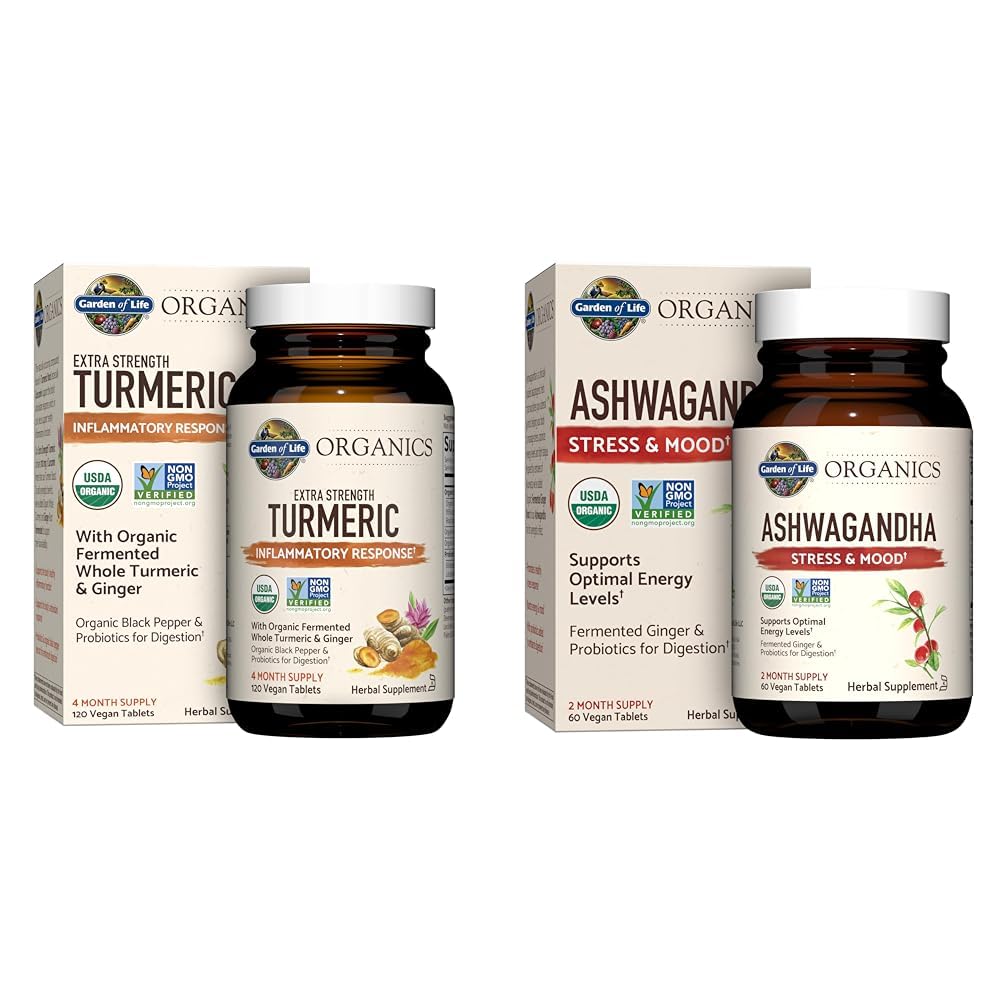 This bundle pairs two complementary herbal supplements from Garden of Life Organics to support healthy inflammation response and help manage stress. The Extra Strength Turmeric contains 100mg of curcumin from organic whole turmeric root to support the body's healthy inflammatory function and antioxidant response. Turmeric root, known for these properties, is combined with ginger root, both fermented to enhance bioavailability. Added organic black pepper extract also aids digestion. The Ashwagandha supplement provides 600mg of organic ashwagandha root to help the body manage stress and promote a healthy stress response. Ashwagandha is an adaptogenic herb clinically studied for these benefits. This formula also aims to boost energy, lift mood, and fight fatigue. It includes probiotics and fermented organic ginger root to further aid absorption and digestion. Together, these two vegan, gluten-free, non-GMO verified supplements offer a one-two punch. The turmeric eases inflammation while the ashwagandha adapts to stress. Their shared ginger and probiotics even team up to help your digestion. So take on life's stresses and aches with an extra dose of organic herbal support from Garden of Life.