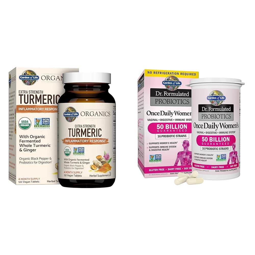 This bundle pairs Garden of Life's Extra Strength Turmeric supplement with their Dr. Formulated Once Daily Women's Probiotic to provide specialized support. The turmeric contains 100mg of curcumin from organic whole turmeric root to help the body's healthy inflammation response and antioxidant systems. It also has ginger root, black pepper, and probiotics to aid digestion and nutrient absorption. The women's probiotic has 16 strains and 50 billion CFU to promote digestive, immune, and vaginal health. It contains clinically studied L. reuteri and L. fermentum strains shown to support women's health by maintaining pH balance and good bacteria. Both supplements are non-GMO, gluten-free, and vegan. By taking these together, you get the benefits of curcumin and probiotics tailored for women's needs. The turmeric aids the body's inflammation response while the probiotic promotes women's digestive and vaginal health. With one capsule of each per day, this bundle offers a convenient way to address multiple health areas simultaneously.