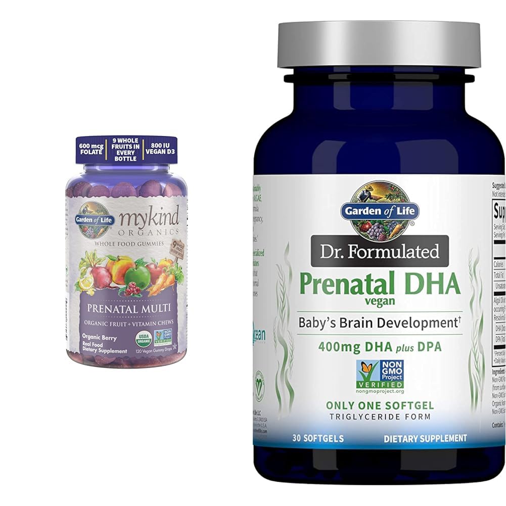 Garden of Life Organics Prenatal Gummies Multivitamin with Vitamin D3, B6, B12, C Folate for Healthy Fetal Development – Organic, Non-GMO, Gluten-Free, Vegan, Berry Flavor, 30 Day Supply Our Prenatal gummies are Certified Organic, Non-GMO Project Verified, NSF Gluten-free, Vegan and Kosher fruit and vitamin chews that contain no synthetic ingredients, artificial flavors or colors. Four Berry gummies promote healthy fetal development with 100 DV of Folate from Organic Lemon Peel and Vegan D3 from Lichen.† With over 100 daily value of vitamins B6 and B12, mom also gets energy support.† We have something to squeal about and that's because there's no pig gelatin over here! With our clean gummy technology, there are no "candy" ingredients, no pig gelatin or corn starch. Adults chew 4 gummies daily with food. †These statements have not been evaluated by the Food and Drug Administration. This product is not intended to diagnose, treat, cure or prevent any disease. Garden of Life Dr. Formulated Prenatal Vegan DHA - Certified Vegan Omega 3 Supplement with 400mg DHA DPA from Algal Omega 3 in Triglyceride Form, Non-GMO Algae Omega 3 for Vegans, 30 Softgels Being vegan doesn't mean you have to be left out when it comes to omega-3s. Whether you are a first-time mom-to-be or a seasoned professional, we all want what's best for our baby. Dr. Formulated Prenatal DHA vegan provides 400mg DHA plus 90mg DPA in one convenient softgel to support baby's brain development.† Our fully traceable and sustainably-sourced Non-GMO vegan algal oil is formulated with specialized pro-resolving mediators (spm), which are compounds that naturally support normal inflammatory responses in the body.† All of this goodness is now delivered in a small, clear softgel that's easy to swallow. Dr. Formulated Prenatal DHA vegan is a smart choice for mom and baby. Garden of Life offers fish oil and other dietary supplements that contain omega fatty acids. Omega fatty acids support the structure and function of the brain and other cells in the body. These sustainably sourced supplements deliver various combinations of omega-3 fatty acids, including EPA (eicosapentaenoic acid), DHA (docosahexaenoic acid) and DPA (docosapentaenoic acid). As essential building blocks of cellular membranes, EPA and DHA play critical roles in maintaining brain and body health. EPA plays a role in supporting a healthy inflammatory response at the cellular level, while DHA is the most abundant omega-3 found in the brain and is important for maintaining brain and nerve cell structure and function. Additionally, DHA and EPA promote healthy blood flow, which is essential to optimal brain function, memory retention and overall health. †These statements have not been evaluated by the Food and Drug Administration. This product is not intended to diagnose, treat, cure or prevent any disease.Product 2: FRESHNESS, PURITY POTENCY GUARANTEED: Vegetarian and vegan-friendly DHA is made following (GMP) Good Manufacturing Practices standards and proudly Third-Party Certified, so you don't have to settle for less than Non-GMO Verified and Certified Vegan. Product 2: OMEGA VEGAN SUPPLEMENT WITH DHA FOR BRAIN AND HEART: Delivers over 400 mg total Omega-3s with naturally occurring Specialized Pro-Resolving Mediators (SPM)—compounds that support the body's normal inflammatory responses—including Resolvins and Protectins. Product 2: CONVENIENT ONCE DAILY VEGAN PRENATAL DHA: Our Doctor formulated Algal Oil DHA formula includes single-sourced Algae (Schizochytrium sp.) which is fully traceable, cultivated and grown to meet the highest quality standards. Product 2: DOCTOR FORMULATED PLANT BASED OMEGA 3 SUPPLEMENT: This great fish oil alternative supports healthy pregnancy, lactation and baby's brain development with 400 mg DHA and 90 mg DPA in the natural Triglyceride Form—now in a small, easy to swallow softgel. Product 1: GUMMY LIKE YOU MEAN IT - We don't sugarcoat in our kitchen we toss our gummies in Organic rice meal to stop them from sticking together—not sugar Our gummies only contain natural sugar from actual fruit that's why they also have 2g of dietary fiber. Product 1: BERRY DELICIOUS: To help make sure your body gets the essential nutrients it needs during this bumpy time, our gummies had to also taste great Our prenatal gummies deliver nutrients that mom and her little seed need in just four yummy berry fruit chews. Product 1: WHOLE FOOD NUTRITION: The body recognizes nutrients when they come from actual food, that's why we start with real Organic fruit Our fresh grown gummies have nine Organic whole fruits in every bottle with pectin made from Non-GMO apples and orange peels. Product 1: TEND THE GARDEN: Our prenatal gummies promote healthy fetal development during pregnancy with 100 daily value of folate from Organic Lemon Peel and 800 IU of Vegan D3 from Lichen Mom gets the energy support she needs with over 100 daily value of B12.