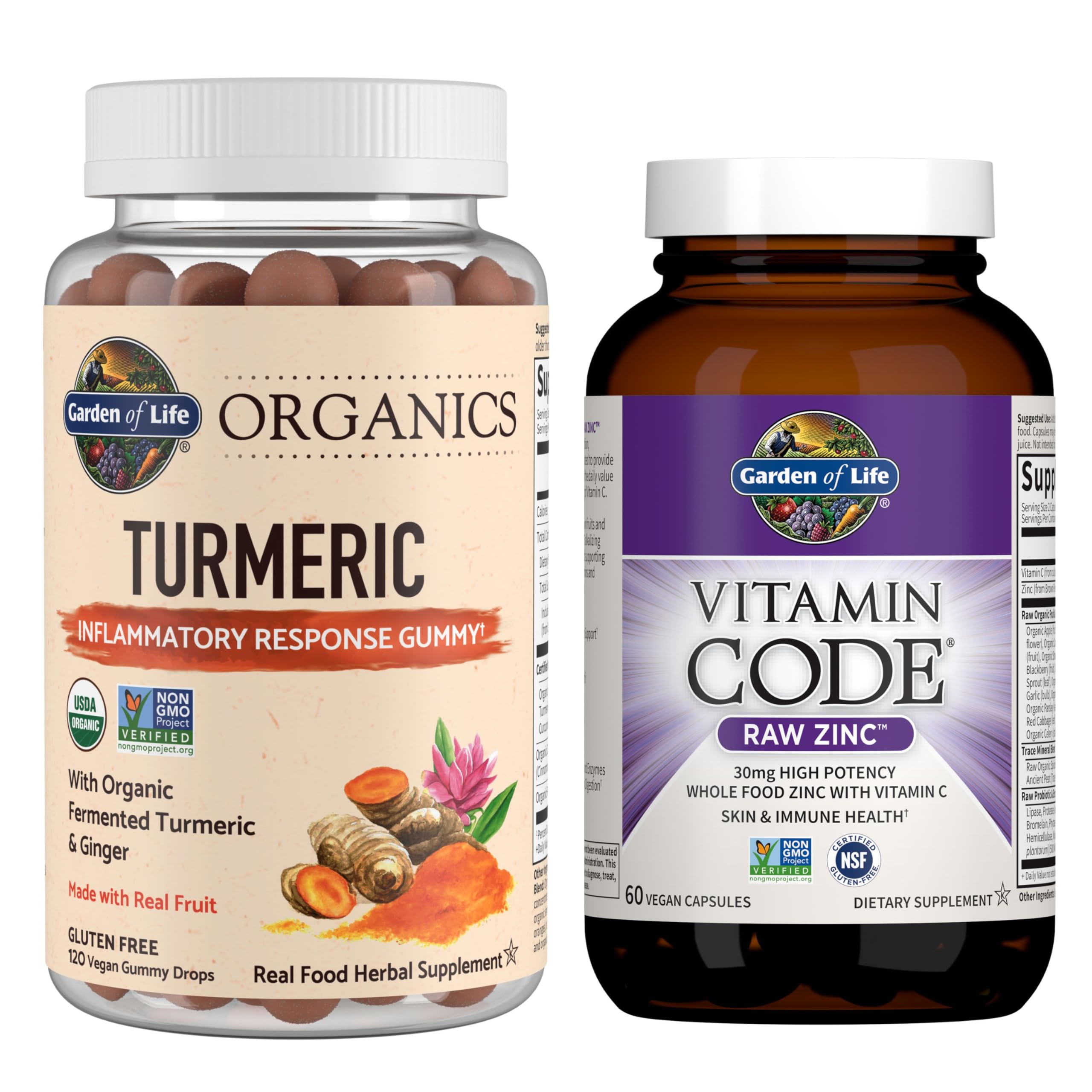 Garden of Life Organics Turmeric Inflammatory Response Gummy - 120 Real Fruit Gummies for Kids Adults, 50Mg Curcumin (95 Curcuminoids), No Added Sugar, Organic, Non-GMO, Vegan Gluten Free Made with Organic Fermented Turmeric Ginger, Garden of Life Organics Turmeric Inflammatory Response Gummy† is made with Certified USDA Organic and Non-GMO Project Verified real fruit—no animal gelatin or refined sugars—just real fruit! Our ingredients are sourced from sustainable organic farms and use an Organic, Non-GMO extraction method without the use of corn alcohol. Garden of Life Zinc Supplements 30mg High Potency Raw Zinc and Vitamin C Multimineral Supplement, Vitamin Code Trace Minerals Probiotics for Skin Health Immune Support, 60 Vegan Capsules Go beyond vitamins and minerals with Vitamin Code Raw Zinc Formula, providing Raw Food-Created Nutrients to support immune system function, healthy wound recovery and DNA synthesis, plus skin, eye and prostate health. By Garden of Life.Product 2: ZINC FOR SKIN HEALTH PLUS PROBIOTICS ENZYMES: Our plant based chelated Zinc vitamin includes a Raw Probiotic and Enzyme blend for added digestive support You can also open the capsules and mix the contents with water or juice, if you wish. Product 2: WHY RAW ZINC: Raw means these Zinc pills are made without high heat, and they contain no synthetic or filler ingredients - Just Raw, food created nutrients for immune system support, skin health and eye health, as well as prostate health. Product 2: NATURAL COFACTORS: Raw Organic fruits vegetables, alkalizing trace minerals and probiotics enzymes add additional antioxidants, vitamins and cofactors to our Vitamin Code Vegan Zinc formula, enabling the natural recognition of nutrients by your body. Product 2: ZINC WITH VITAMIN C FOR IMMUNE HEALTH: Our Zinc supplement provides whole food nutrition with 30mg of elemental Zinc (over 250 of the new daily value) plus 60mg of raw vitamin C, both in a whole food form for optimal nutrient absorption and utilization. Product 1: Nutrients from real foods using gentle water extraction. It is manufactured in a facility that also processes soy, dairy, egg, peanut, tree nuts, fish and shellfish. Product 1: Made with real fruit, no animal gelatin - no artificial dyes or added sweeteners. Product 1: Organic fermented turmeric with 50mg curcumin and ginger root, black pepper fruit and cinnamon. Product 1: Turmeric Inflammatory Response Gummy.