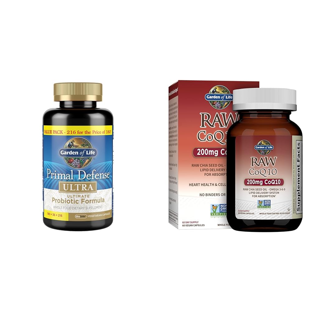 Garden of Life Probiotic Primal Defense Ultra 216 Capsules and Omega 3 6 9 CoQ10 60 Capsules Supplement Bundle