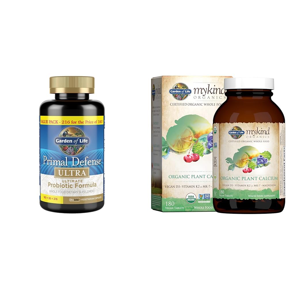 This bundle pairs two complementary digestive and gut health supplements from Garden of Life. The Primal Defense Ultra probiotic provides 15 billion CFUs spanning 13 strains, including soil-based Homeostatic Soil Organisms. It promotes digestive regularity, immune function, nutrient absorption, and intestinal comfort. The mykind Organics Plant Calcium adds 800mg of highly bioavailable, organic plant-sourced calcium alongside magnesium, vegan D3, and MK7. This food-based formula supports bone health and teeth maintenance through easily digested calcium and vitamin cofactors. Together, these products target digestive support from multiple angles. The probiotic populates the gut microbiome for healthy digestion and elimination. The calcium formula also eases digestion using clean ingredients. As the probiotic aids nutrient absorption, the plant calcium delivers bone-building calcium and cofactors to where they need to go. The end result is robust gut and digestive health for optimized nutrient utilization and comfort.