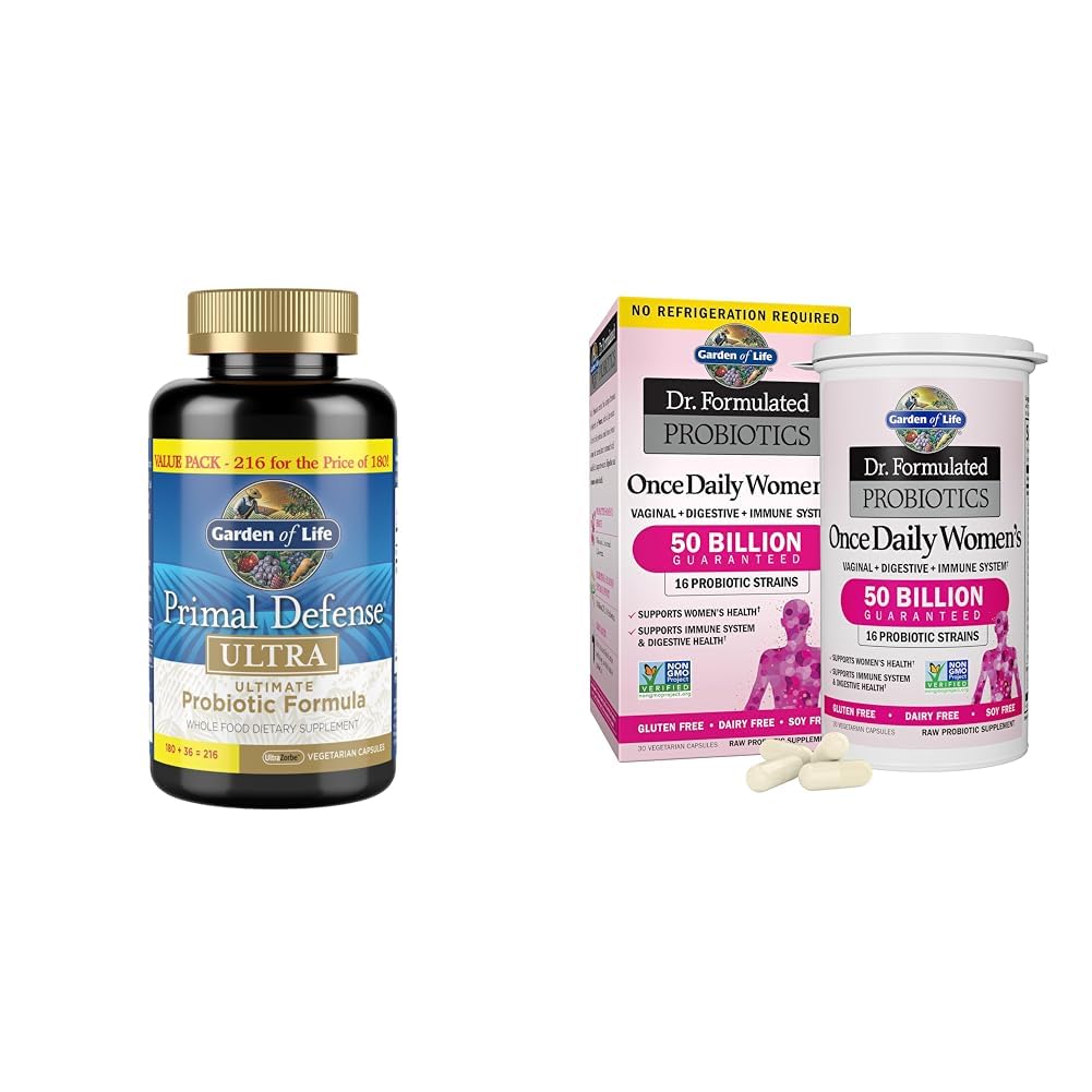Garden of Life Probiotics Bundle - Primal Defense Ultra Ultimate Probiotic 216 Capsules + Dr. Formulated Probiotics for Women 50 Billion CFU 30 Capsules