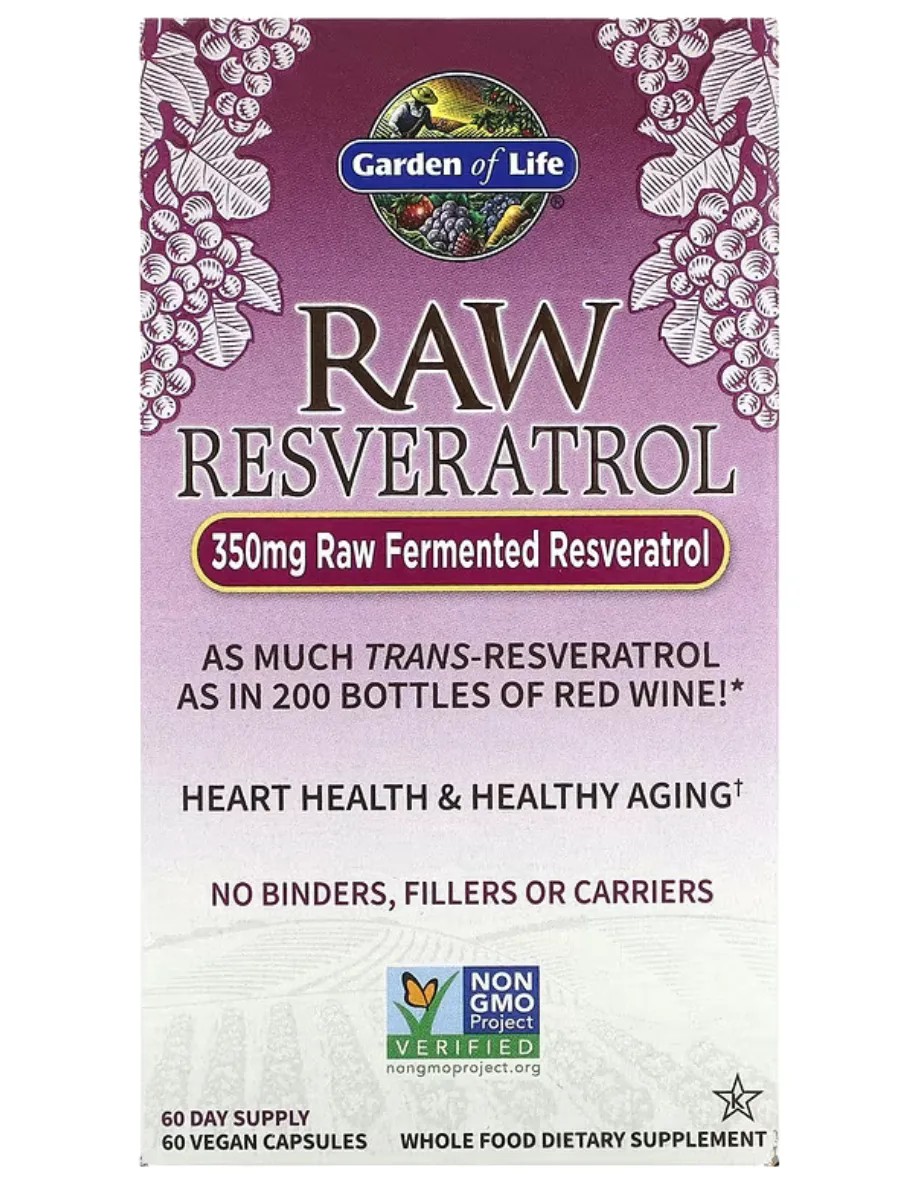 Garden of Life RAW Resveratrol — мощный антиоксидантный комплекс на основе ферментированного транс-ресвератрола, предназначенный для поддержки здоровья сердца, борьбы с окислительным стрессом и замедления процессов старения. Каждая порция (1 капсула) содержит 350 мг транс-ресвератрола, эквивалентного содержанию в 200 бутылках красного вина. Продукт включает 23 органических фрукта и овоща, таких как виноград Каберне Совиньон, а также живые пробиотики и ферменты для поддержки пищеварения. Не содержит ГМО, глютен, сою, молочные продукты, искусственные красители, наполнители или консерванты, подходит для веганов и сертифицирован по стандартам Non-GMO Project, NSF Gluten-Free и кошерности.