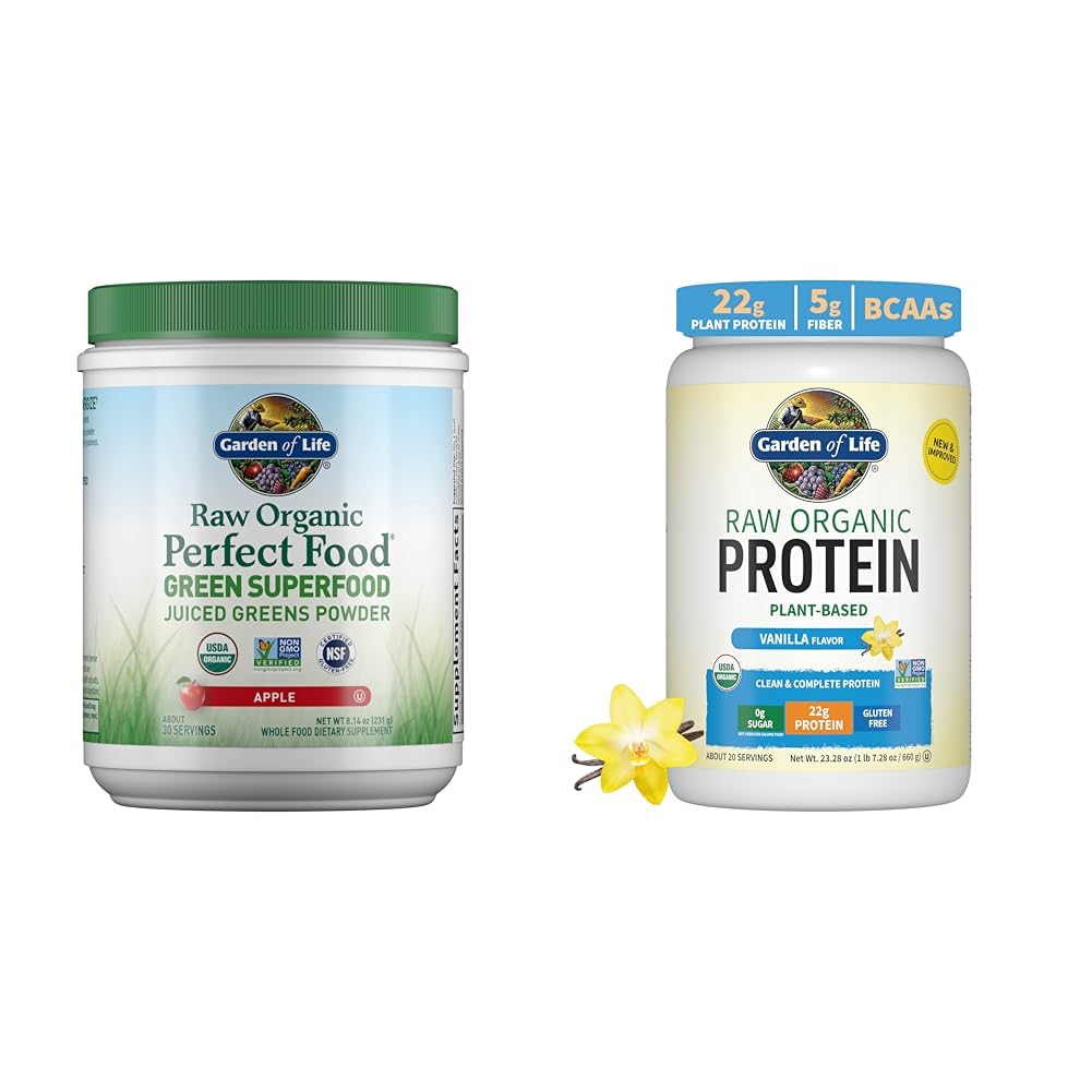 Garden of Life Raw Organic Perfect Food Green Superfood Juiced Greens Powder - Apple Flavor, 30 Servings - Vegan Gluten Free Whole Food Dietary Supplement, Greens Plus Probiotics Enzymes Capture the power of the sun with raw organic perfect food, packed with the power of nutrient-dense, raw, organically grown greens, sprouts and vegetable juices for the raw energy you need. Raw organic perfect food is the convenient, delicious way to get your Veggie Juice every day. Organic Vegan Vanilla Protein Powder - Garden of Life – 22g Complete Plant Based Raw Protein BCAAs Plus Probiotics Digestive Enzymes for Easy Digestion – Non-GMO, Gluten-Free, Lactose Free 1.5 LB We're taking a stand against chalky and bringing tasty back to your protein. Raw Organic Protein has been shaken up to provide you with improved texture, mixability and downright delicious taste! What's the scoop? 22g of clean and complete plant protein with naturally occurring BCAAs plus raw probiotics and enzymes to help build muscle, reduce recovery time and provide digestive support.† Adults mix 1 scoop with 10oz of water or plant milk. Parents should discuss the product with kids' pediatrician or nutritionist if they recommend additional protein. Total Net Carbs Total Carbohydrates – Dietary Fiber Howatson, G., M. Hoad, S. Goodall, J. Tallent, P.G. Bell, and D.N. French. 2012. Exercise-induced muscle damage is reduced in resistance-trained males by branched chain amino acids: a randomized, doubleblind, placebo controlled study. J.Int.Soc.Sports Nutr. 9:20-2783-9-20. eCollection 2012. †These statements have not been evaluated by the Food and Drug Administration. This product is not intended to diagnose, treat, cure or prevent any disease.Product 2: DON'T TAKE THE HEAT: Made at low temperatures, Raw Organic Protein is anything but ordinary Scoop up digestive enzymes like lipase, lactase and papain plus live probiotics including probiotic Bacillus subtilis DE111 for digestion and proper absorption. Product 2: SHAKE IT UP: Raw Organic Protein has been shaken up to improved texture and mixability all while being sugar free Organic peas, sprouted grains, seeds, legumes plus whole food vitamins and minerals deliver nutrients you need with 1g total net carbs. Product 2: DOWNRIGHT DELICIOUS: We're taking a stand against chalky and bringing tasty back Not only is Raw Organic Protein now easy to mix and silky smooth, but our Vanilla Flavor is downright delicious Mix with water, blend in smoothies or add in to baked goods. Product 2: WHAT'S THE SCOOP: Rebuild broken muscle and reduce recovery time with 22g of complete plant-based protein and 4g of a complete branched chain amino acid profile But that's not all—stay satiated longer with 5g of fiber in just 130 calories per serving. Product 1: Digestive support: our greens powder is bursting with live probiotics and enzymes for digestion SUPPORT. Product 1: Immune System support: This superfood supplement supports healthy digestion, detoxification, a healthy immune system, and already healthy blood sugar levels and metabolism. Product 1: Whole Food supplement: Our whole food greens supplement provides naturally occurring antioxidants, enzymes, amino acids, essential fatty acids, and dozens other phytonutrients. Product 1: Superfood supplement: This greens powder is packed with raw organic greens, sprouts and vegetable juices for raw energy.