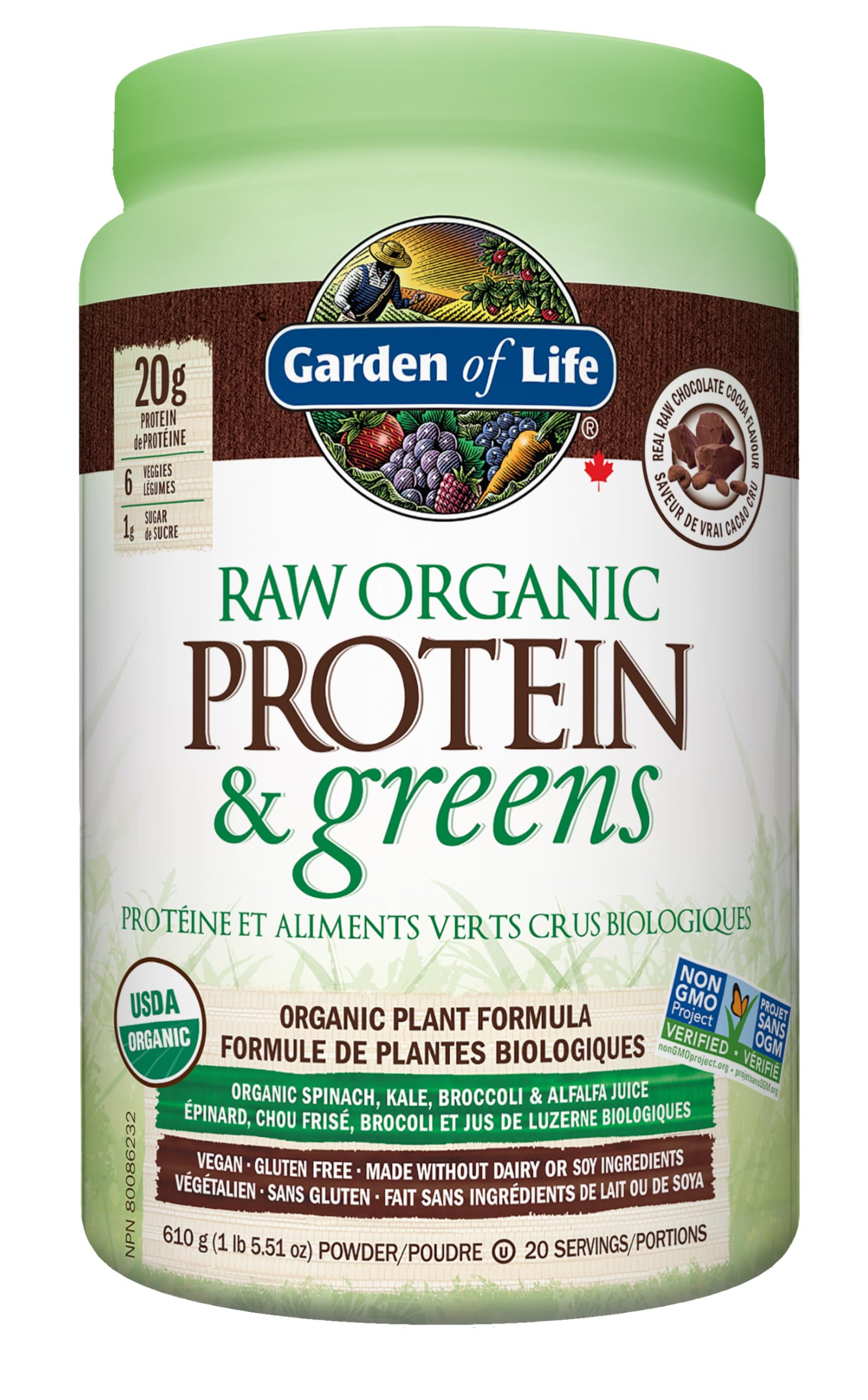 Garden of Life Raw Organic Protein & Greens - Chocolate 610.0 Gram Chocolate. Packed with 20g of protein 6 veggies and 1g sugar. A delicious protein boost from organic sprouted brown rice organic pea & organic chia plus a blend of nutrient-rich greens. Gl