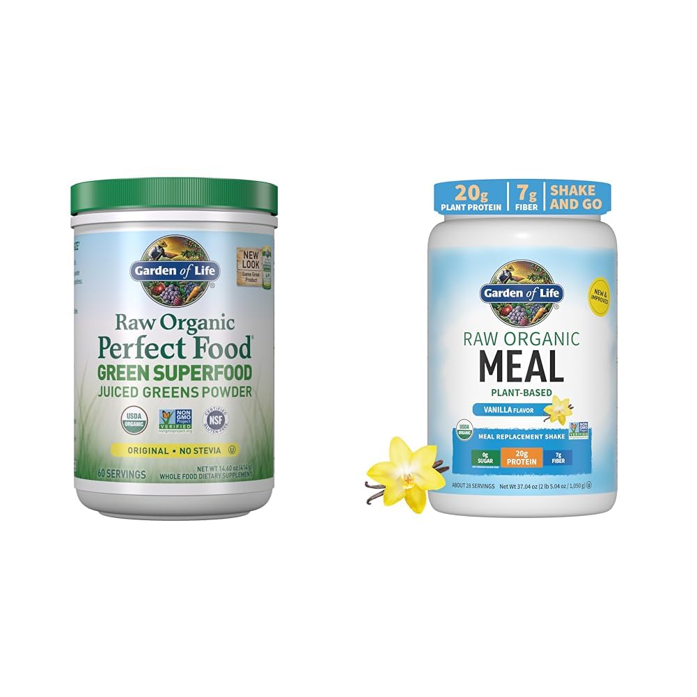 Garden of Life Super Greens Powder Smoothie Mix, Probiotics Digestive Enzymes for Digestive Health, Organic Superfoods Nutrition Fruit and Vegetables for Women Men Energy, Original, 60 Servings Capture the power of the sun with Raw Organic Perfect Food, packed with the power of nutrient-dense, RAW, organically grown greens, sprouts and vegetable juices for the RAW ENERGY you need. Raw Organic Perfect Food is the convenient, delicious way to get your veggie juice every day. Garden of Life Vegan Protein Powder - Raw Organic Meal Replacement Shakes - Vanilla - Pea Protein, Greens and Probiotics for Women and Men, Plant Based Dairy Free All in One Shake, 28 Servings We're taking a stand against chalky and bringing tasty back to your protein. Raw Organic Meal has been shaken up to provide you with improved texture, mixability and downright delicious taste! What's the scoop? 20g of clean and complete plant protein with whole food vitamins and minerals plus raw probiotics, prebiotics, superfoods and digestive enzymes to help build muscle and provide digestive support.† Adults mix 1 scoop with 8oz of water or plant milk. Parents should discuss the product with kids' pediatrician or nutritionist if they recommend additional protein. Not a reduced calorie food. †These statements have not been evaluated by the Food and Drug Administration. This product is not intended to diagnose, treat, cure or prevent any disease.Product 2: DON'T TAKE THE HEAT: Made at low temperatures, Raw Organic Meal is anything but ordinary Scoop up digestive enzymes like lipase, lactase and papain plus live probiotics including probiotic Bacillus subtilis DE111 for digestion and proper absorption. Product 2: SHAKE IT UP: Raw Organic Meal has been shaken up to provide improved texture and mixability Organic peas, sprouted grains, seeds and legumes plus whole food vitamins and minerals deliver nutrients you need while also being low in net carbs and 0g sugar. Product 2: DOWNRIGHT DELICIOUS: We're taking a stand against chalky and bringing tasty back Not only is Raw Organic Meal now easy to mix and silky smooth, but our Vanilla Flavor is downright delicious Mix with water, blend in smoothies or add in to baked goods. Product 2: WHAT'S THE SCOOP: Why have a snack when you can have the whole meal? This all-in-one protein shake is made for any time of the day: 20g of complete plant-based protein will leave you satiated longer thanks to 7g of fiber in just 150 calories per serving. Product 1: DIGESTIVE SUPPORT: Our greens powder is bursting with live probiotics and enzymes for digestion support. Plant based. Product 1: IMMUNE SYSTEM SUPPORT: This superfood supplement supports healthy digestion, detoxification, a healthy immune system, and already healthy blood sugar levels and metabolism.Store in a cool, dry place. Product 1: WHOLE FOOD SUPPLEMENT: Our whole food greens supplement provides naturally occurring antioxidants, enzymes, amino acids, essential fatty acids, and dozens other phytonutrients. Product 1: SUPERFOOD SUPPLEMENT: This greens powder is packed with RAW organic greens, sprouts and vegetable juices for raw energy.