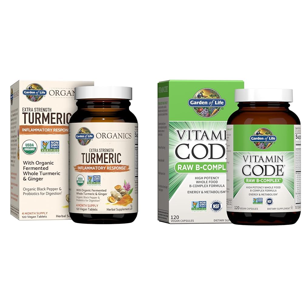 This bundle pairs Garden of Life's extra strength turmeric and vitamin B complex supplements to provide antioxidant support and help maintain energy levels. The turmeric contains a high potency 100mg curcumin from organic turmeric root to support the body's healthy inflammation response. It also includes ginger root, both fermented to increase bioavailability, as well as probiotics and black pepper extract to further enhance digestion. The B complex features raw, whole food-derived B vitamins including vitamin B12, folate, and vitamin B6 to catalyze cellular energy production and support physical and mental energy, heart health, immune function, and healthy stress response. It also contains probiotics, enzymes, and organic fruits and vegetables. Together, these two Garden of Life supplements offer a powerful combination of curcumin and B vitamins sourced from organic whole foods to provide antioxidant and inflammation support while maintaining energy levels and overall wellbeing.