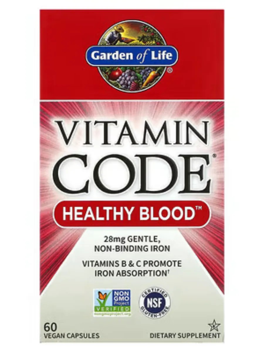 Vitamin Code Healthy Blood contains 28 mg of gentle, non-binding iron, plus vitamins B-12, C, and folate, which help your body properly absorb and utilize iron.