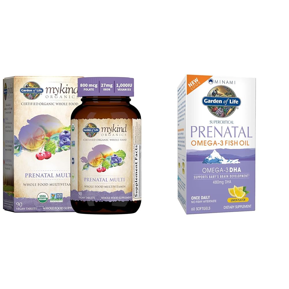 Product 2: CLEAN LEMON FLAVOR-NO FISHY AFTERTASTE: One of the highest concentrated Omega-3 fish oils available, Prenatal delivers pure Omega-3 nutrition that nature made in a Lemon flavor-with fewer softgels, no fillers or saturated fats-and no fishy aftertaste!. Product 2: JUST ONE A DAY: When searching for prenatal DHA supplements, purity convenience are on top of mama's list Our premium fish oil supplement delivers 480mg DHA, 104mg EPA 56mg of other Omegas, giving you pure Omega-3 nutrition in one convenient softgel. Product 2: DHA FROM PREGNANCY TO BREASTFEEDING: The demand for Omega 3 DHA increases during pregnancy, and DHA taken during lactation enhances the quality of breast milk DHA is also an essential nutrient for proper development of infants and children. Product 2: PRENATAL DHA OMEGA-3 FISH OIL THAT GIVES BACK: Supercritical Prenatal Fish Oil supports baby's brain development, offering mom 640mg total Omega-3s during pregnancy breastfeeding For every bottle sold, we give National Parkinson Foundation a donation. Product 1: CLEAN TABLET TECHNOLOGY: Our innovative process uses 100 percent whole food plant material to make tablets that are easy to digest and dissolve in 45 minutes, ensuring high bioavailability and comfortable digestion—free of synthetic binders and fillers. Product 1: SOOTHING: A multivitamin made with a certified Organic Stomach-soothing Blend featuring ginger, peppermint, lemon and tomato to help with feelings of nausea It also delivers 27mg of non-constipating iron to help support daily iron levels. Product 1: WHOLE FOOD NUTRITION: The body recognizes nutrients when they come from actual food, that's why we start with whole foods Our prenatal multivitamin formula is made with over 30 organic fruits, veggies and herbs to provide what you need in natural form. Product 1: TEND THE GARDEN: Our fresh grown prenatal multi promotes healthy fetal development with over 100 percent daily value of folate from Organic Lemon Peel and vegan D3 from Lichen Mom also gets energy support from over 100 percent daily value of B vitamins.