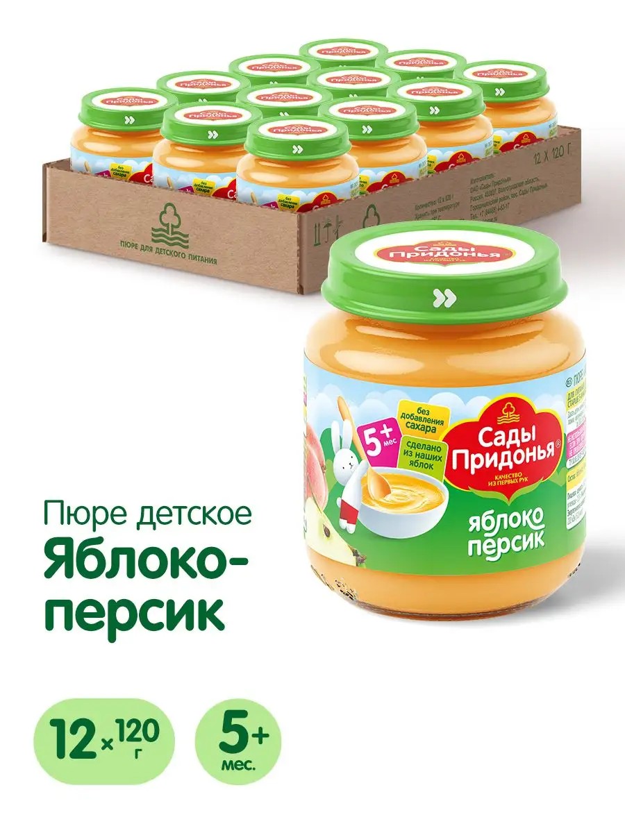 Яблочно-персиковое пюре приготовлено на основе зелёных донских яблок, выращенных в садах компании. Персик содержит витамины группы В, минеральные вещества, бета - каротин и пектиновые вещества. Наличие в пюре пектинов и пищевых волокон способствует профилактике запоров у маленького ребёнка.