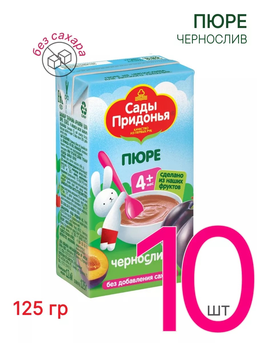 Детское пюре из чернослива Сады Придонья рекомендуется в качестве первого прикорма детей старше 4 месяцев. Чернослив — природный источник калия и пектиновых волокон. Пюре производится из специального сорта сливы, имеющего характерный вкус, аромат и свойства. Пюре из чернослива имеет низкоаллергенный характер. Чернослив содержит пектин и пищевые волокна, которые оказывают положительное стимулирующее воздействие на желудочно-кишечный тракт. Пюре из чернослива помогает решить проблему запоров у ребёнка. Монокомпонентное пюре приготовлено без добавления сахара, соли, крахмала. Рекомендуется давать детям старше 4 месяцев, начиная с 0,5 чайной ложки, увеличивая к 12 месяцам до 100 г в день.
