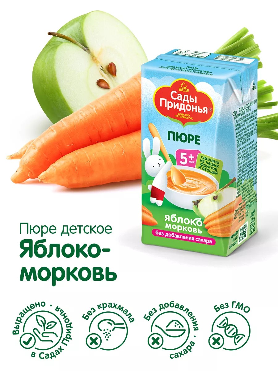 Детское морковное (яблоко-морковь) овощное пюре Сады Придонья имеет приятный вкус без добавления сахара и соли. Морковь — источник витаминов А,В, С, Е, натрия, калия, фосфора, фолиевой кислоты. Морковное пюре содержит пищевые волокна, что способствует хорошему пищеварению и лучшему усвоению полезных веществ. Приготовлено из свежих овощей.