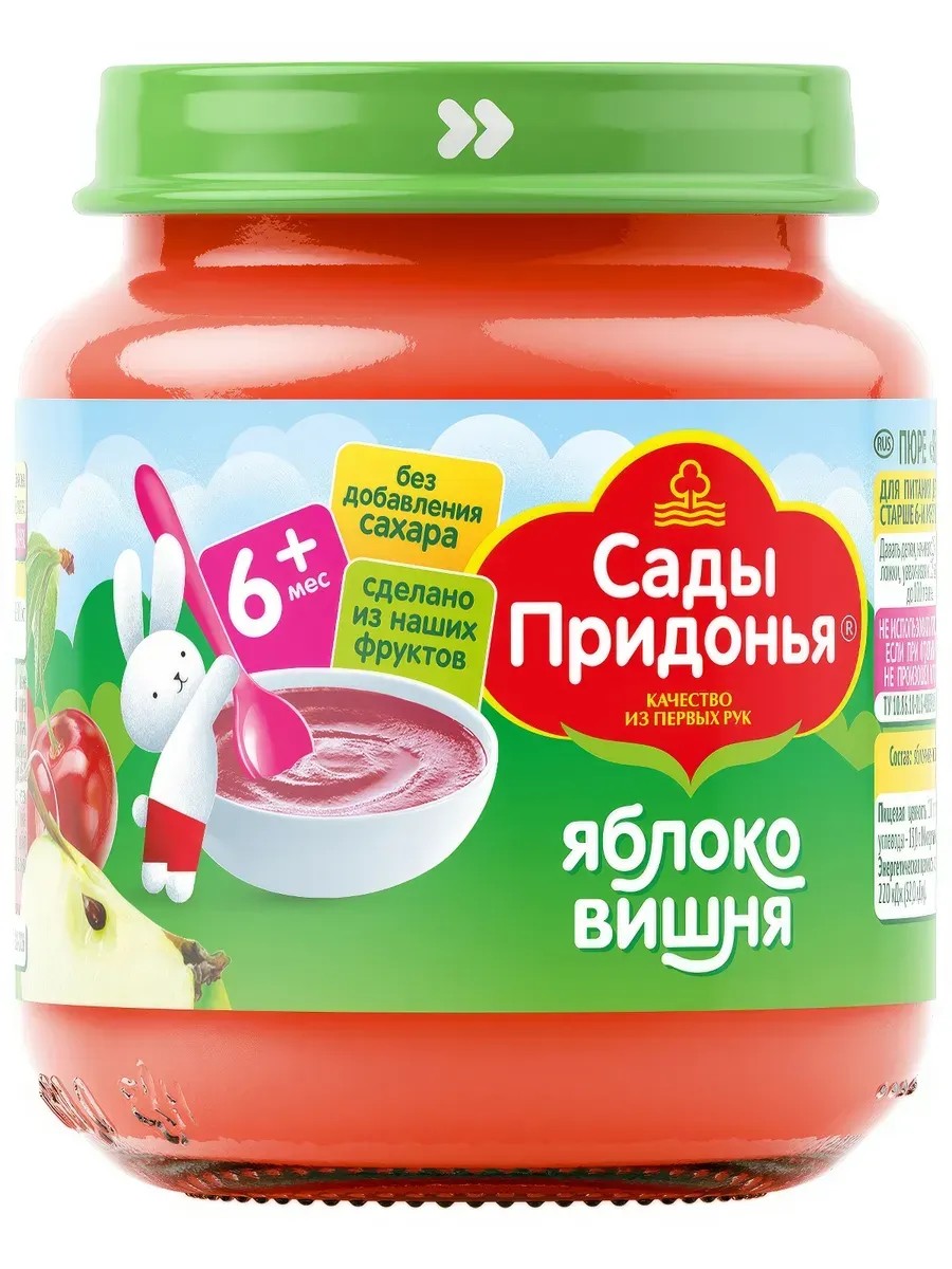 Детское пюре Сады Придонья приготовлено из собственных яблок и вишни, выращенных в садах компании. Мы бережно собираем яблоки и вишню и перерабатываем, сохраняя витамины, микроэлементы и полезные свойства. Сладкое яблочное пюре сглаживает кислинку вишни. Благодаря высокому содержанию железа, яблочно-вишневое пюре хорошо помогает при железодефицитной анемии у ребенка. Рекомендовано детям старше 6-и месяцев. Давать детям, начиная с 0, 5 чайной ложки, увеличивая к 12 месяцам до 100г в день. Вкусное, нежное, 100% натуральное пюре богато витаминами, минеральными веществами, содержит полезный для желудка пектин, органические кислоты и клетчатку, благоприятно воздействующую на работу кишечника.