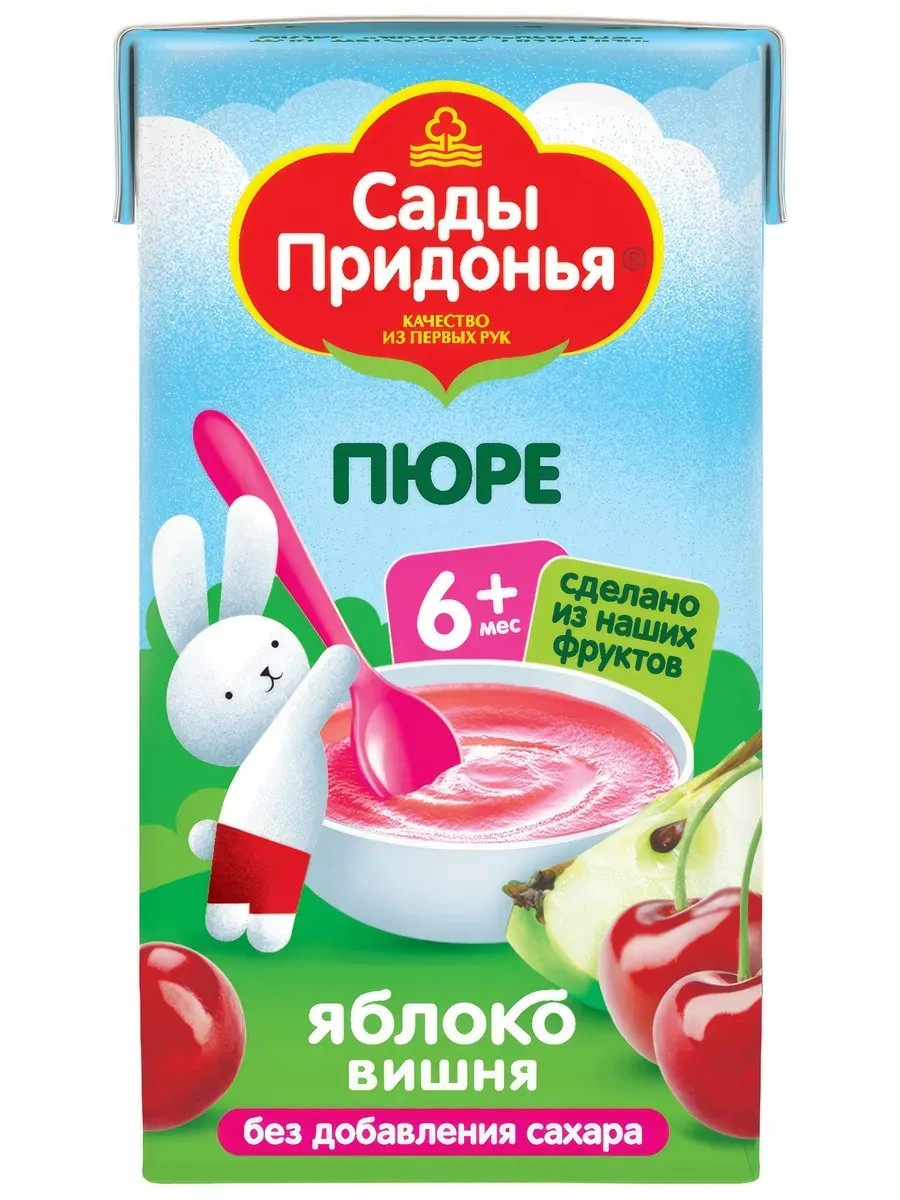 Пюре приготовлено из собственных яблок и вишни, выращенных в садах компании. Мы бережно собираем вишню и перерабатываем, сохраняя витамины, микроэлементы и полезные свойства. Сладкое яблочное пюре сглаживает кислинку вишни. Благодаря высокому содержанию железа, яблочно-вишневое пюре хорошо помогает при железодефицитной анемии у ребенка.