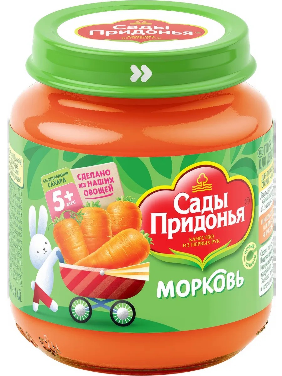 Carrots are a source of beta-carotene (provitamin A), vitamins B, C, and E, sodium, potassium, phosphorus, and folate. Carrot puree contains a large amount of dietary fiber and promotes good digestion. The product is beneficial for vision and strengthens the child's immune system. Vegetables grown on the company's own farms are used in the production of this puree.