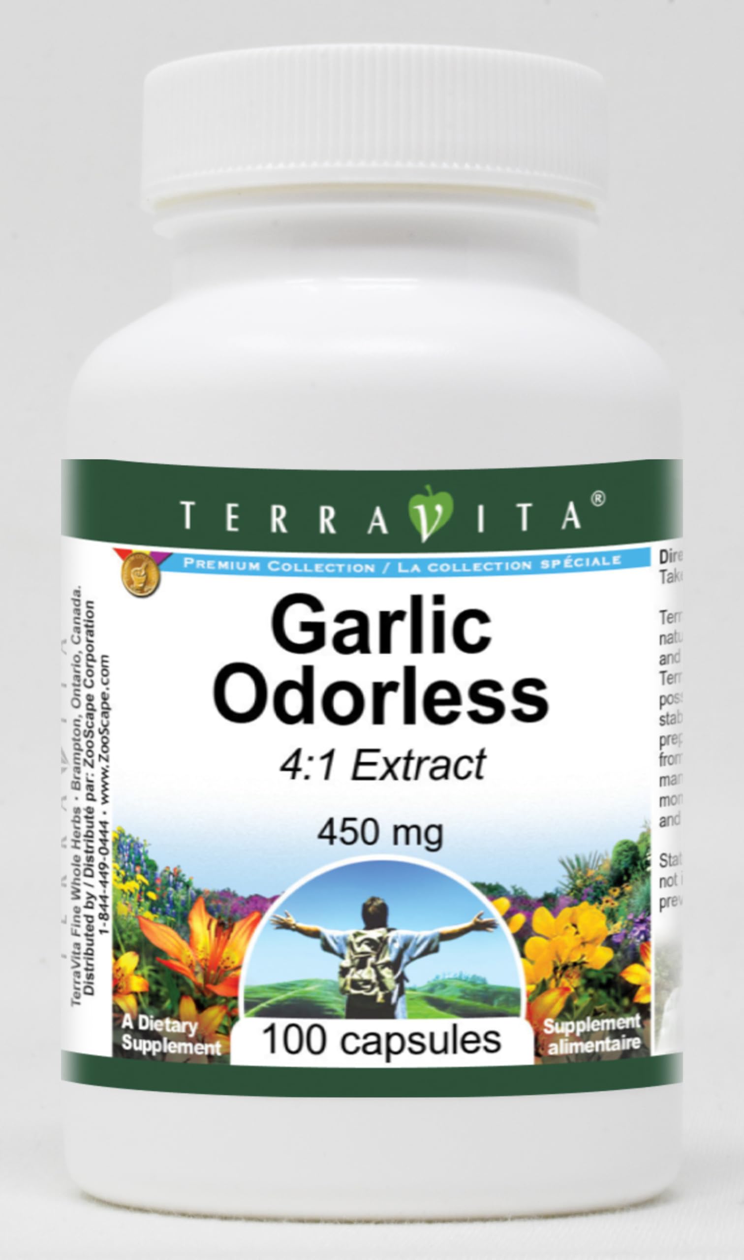 Garlic Odorless 4:1 - 450 mg (100 capsules, ZIN: 520197) Packaged in the United States in a GMP certified facility (Good Manufacturing Practice). No fillers. Manufacturer: TerraVita Size: 100 capsules Easy-to-swallow Capsules in a sealed bottle. Ingredients: Gelatin, Water, Garlic Odorless 4:1 Extract - 450 mg