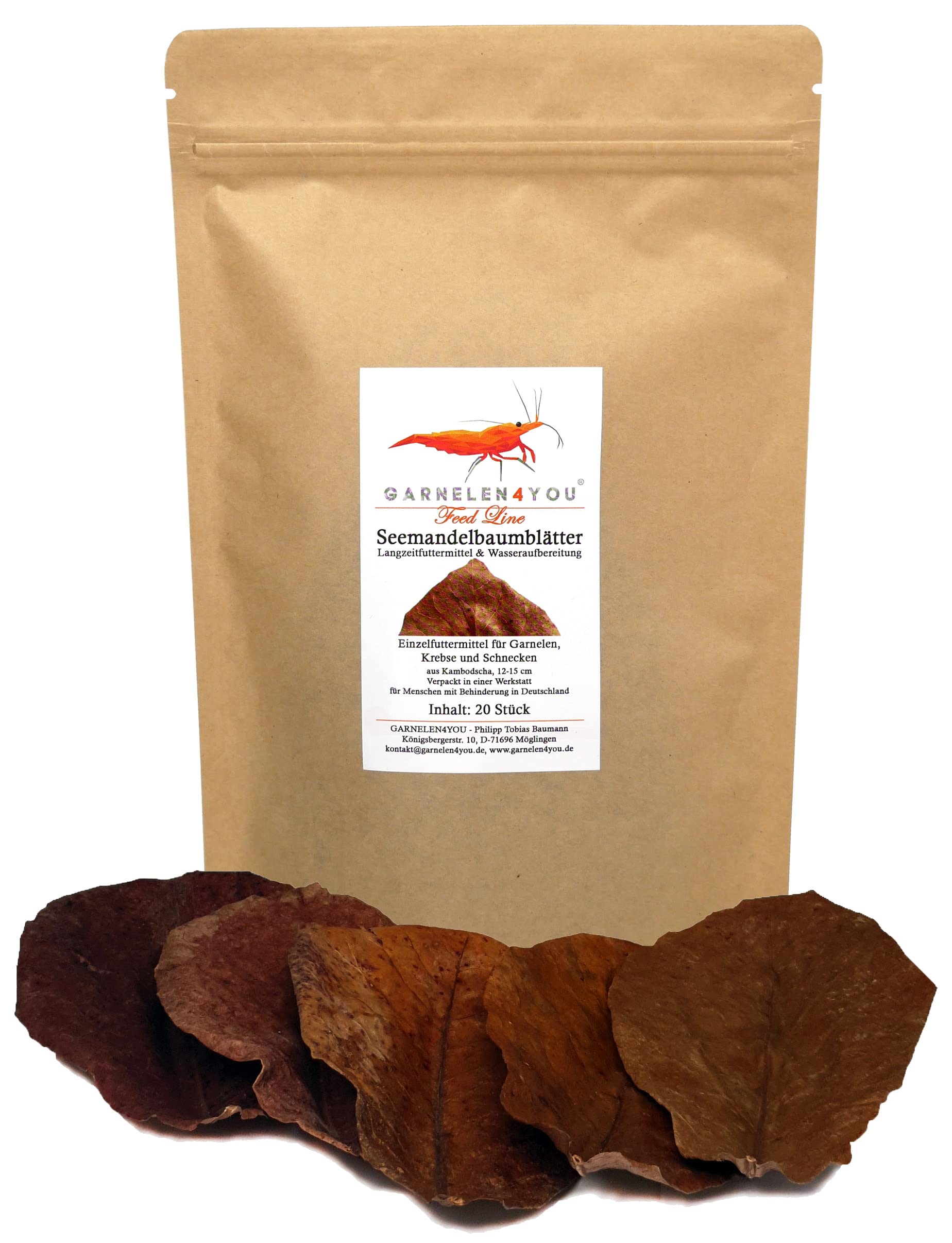 Garnelen4you Seiferelbau leaves - from the shrimp lover for shrimp lovers For the best health and a stable water biology Scientific background: The leaves of the Seiferelbaum (Terminalia Catappa) have been known in aquaristics as well as vertebral and ornamental fishing breeding for decades due to their health-promoting properties (Ikhwanuddin et al., 2014).Valuable ingredients such as flavonoids, humic acids, tannins and saponins (Ahmed et al., 2005) are handed over to the water and have an antibiotic, antifungal, Muangsan and Senamontee, 2008 Goun et al., 2003), anti -inflammatory (fan et al.,2004) and antioxidant (Kinoshita et al., 2007).Therapeutically and preventive, the dried leaves are used for bacterial and fungal infections, spawning pilot, gillworms, mucous membrane damage, fin rot, bite wounds and hole disease (Chansue et al., 2004 Schliewen, 2017). In addition, seafaring tree leaves themselves, as well as as an growth area, represent an excellent long -term feed for invertebrates such as shrimp, crabs and snails. They also offer hiding places for the rearing of young animals and give aquariums, terrariums and palludariums a natural appearance. Application: 10 cm sheet per 30 liters of aquarium water.The release of the health -promoting ingredients is preserved for about 3 weeks and colored the aquarium water slightly brownish.The pH value is slightly reduced by the humic acids, but the conductor is hardly influenced. Seetemenbaum leaves are natural products.The nature, coloring and size can therefore vary. Garnelen4you Seiferelbaumblätter are a product of the biologist and shrimp breeder Dr.Philipp T. Baumann and are also successfully used in his breeding. Ingredients ingredients Natural ingredients such as humic acids, flavonoids, tannins etc. Instructions 10-15 cm leaf to 20-30 liters of aquarium water.15-20 cm leaf to 60 liters of aquarium water.Renew every 1-2 weeks. More✓ packaged in a workshop for people with disabilities in Germany Further product information in the product information sheets According to the feed ordinance: single feed for invertebrate aquarium residents such as shrimp, crabs and snails.A product of the biologist and shrimp breeder Dr.Philipp T. Baumann.✓ In the climate -neutral protective bag, sealed re -lockable, to protect the valuable ingredients.For the most part of renewable raw materials with biotechnologically produced bioplastic content made of sugar cane instead of oil to reduce ecological footprint.✓ Perfect size: 10-15 cm (20 pieces) - ideal for shrimp aquariums from 20 liters The highest quality and safety by moving into sea alt tree leaves made of unencumbered forest regions in Indonesia, harvested by hand and dried in the sun.Continued in the in -house breeding system and in numerous other shrimp lovers.✓ Natural long -term feed as well as an growth area for useful microorganisms and thus pasture surface for shrimp, crayfish and snails.Seetemenbaum leaves also enable a natural aquarium design and offer hiding places for young animals.Application: 10-15 cm per 30 liters of aquarium water.✓ Best health and stable water biology thanks to valuable, partly water -soluble ingredients such as humsic acids, flavonoids, tannins and saponins with antibiotic, antifungal, anti -inflammatory and antioxidant properties.GARNELEN4YOU Seemandelbaumblätter – Vom Garnelenliebhaber für Garnelenliebhaber Für beste Gesundheit und eine stabile Wasserbiologie Wissenschaftlicher Hintergrund: Die Blätter des Seemandelbaums (Terminalia catappa) sind in der Aquaristik sowie Wirbellosen- und Zierfischzucht seit Jahrzehnten aufgrund ihrer gesundheitsfördernden Eigenschaften bekannt (Ikhwanuddin et al., 2014). Wertvolle Inhaltsstoffe wie Flavonoide, Huminsäuren, Tannine sowie Saponine (Ahmed et al., 2005) werden an das Wasser abgegeben und wirken antibiotisch, antimykotisch (Muangsan und Senamontee, 2008 Goun et al., 2003), entzündungshemmend (Fan et al., 2004) und antioxidativ (Kinoshita et al., 2007). Therapeutisch sowie präventiv werden die getrockneten Blätter bei bakteriellen sowie Pilzinfektionen, Laichverpilzung, Kiemenwürmern, Schleimhautschäden, Flossenfäule, Bisswunden und der Lochkrankheit eingesetzt (Chansue et al., 2004 Schliewen, 2017). Außerdem stellen Seemandelbaumblätter selbst, sowie als Aufwuchsfläche, ein hervorragendes Langzeitfuttermittel für Wirbellose wie Garnelen, Krebse und Schnecken dar. Ebenso bieten sie Versteckmöglichkeiten für die Aufzucht von Jungtieren und geben Aquarien, Terrarien und Palludarien ein naturnahes Aussehen. Anwendung: 10 cm Blatt pro 30 Liter Aquarienwasser. Die Freisetzung der gesundheitsfördernden Inhaltsstoffe bleibt über ca. 3 Wochen erhalten und färbt das Aquarienwasser leicht bräunlich. Durch die Huminsäuren wird der pH-Wert leicht gesenkt, der Leitwert jedoch kaum beeinflusst. Seemandelbaumblätter sind Naturprodukte. Die Beschaffenheit, Färbung und Größe können daher variieren. GARNELEN4YOU Seemandelbaumblätter sind ein Produkt des Biologen und Garnelenzüchters Dr. Philipp T. Baumann und kommen auch in dessen Zucht erfolgreich zum Einsatz. INHALTSSTOFFE ZUTATEN natürliche Inhaltsstoffe wie Huminsäuren, Flavonoide, Tannine etc. GEBRAUCHSANWEISUNG 10-15 cm Blatt auf 20-30 Liter Aquarienwasser. 15-20 cm Blatt auf 60 Liter Aquarienwasser. Alle 1-2 Wochen erneuern. Mehr✓ Verpackt in einer Werkstatt für Menschen mit Behinderung in Deutschland Weitere Produktinformationen in den Produktinformationsblättern Nach Futtermittelverordnung: Einzelfuttermittel für wirbellose Aquarienbewohner wie Garnelen, Krebse und Schnecken. Ein Produkt des Biologen und Garnelenzüchters Dr. Philipp T. Baumann. ✓ Im KLIMANEUTRALEN SCHUTZBEUTEL, versiegelt wiederverschließbar, zum Schutz der wertvollen Inhaltsstoffe. Zum Großteil aus NACHWACHSENDEN ROHSTOFFEN mit biotechnologisch hergestelltem Biokunststoffanteil aus Zuckerrohr statt Erdöl zur Reduzierung des ökologischen Fußabdrucks. 