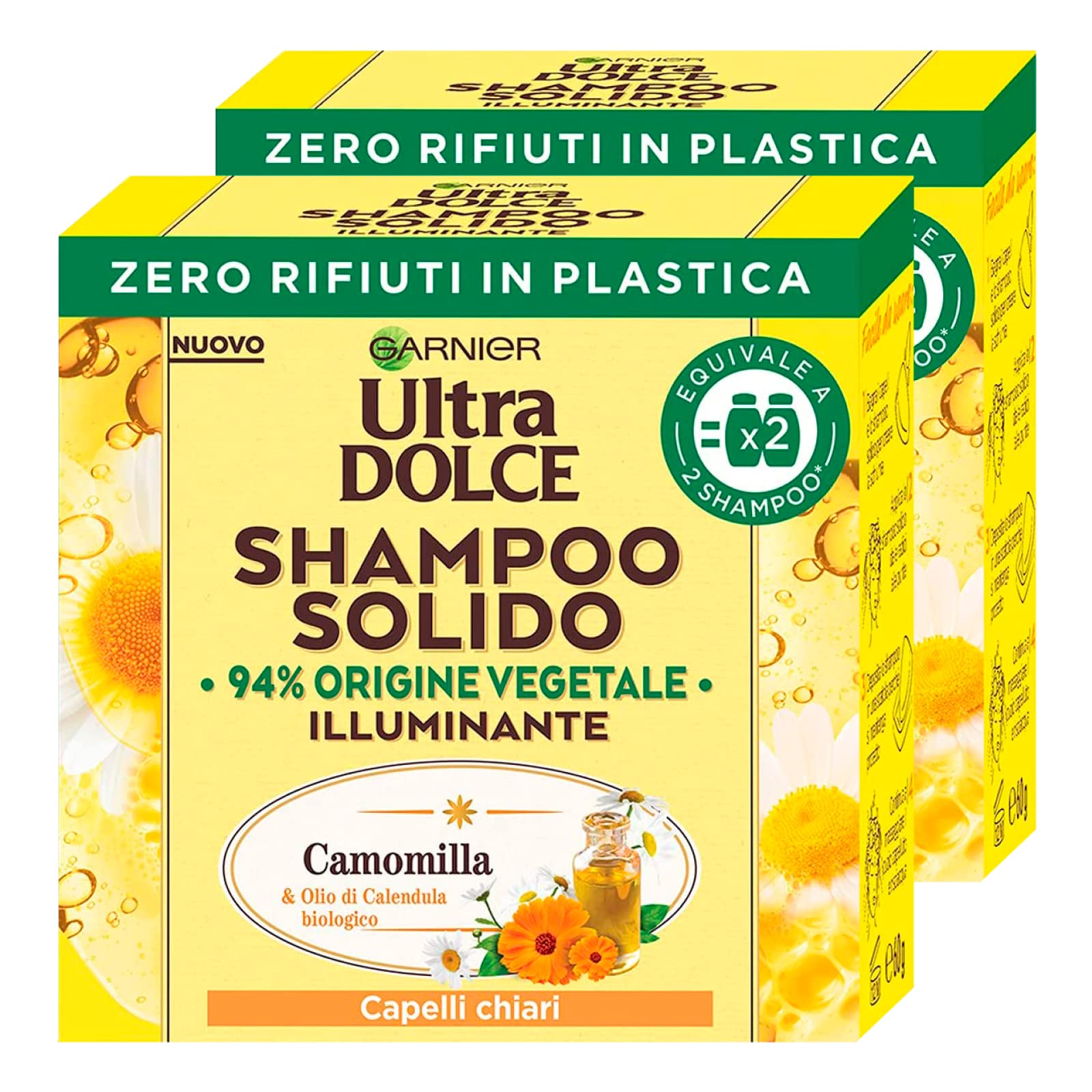 Garnier 2x Garnier Ultra Doux Illuminating Solid Shampoo with Chamomile and Organic Calendula Oil with naturally derived ingredients for light hair 2 solid shampoos of 60g