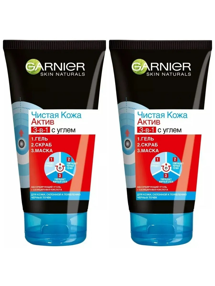 Garnier, Гель 3-в-1 с углем для лица против черных точек 150 мл. 3-в-1 от Гарньер Чистая Кожа - это многофункциональное средство, которое не только визуально уменьшает черные точки и прыщи, но и помогает предотвратить их появление, это одновременно Гель для умывания, Скраб и Маска: 1. Гель для умывания: обогащенный Салициловой кислотой, известной своими антибактериальными свойствами, гель интенсивно очищает кожу от загрязнений. Наноси ежедневно на влажную кожу лица. Тщательно смой водой. 2. Скраб: благодаря содержанию натуральных отшелушивающих частиц помогает эффективно бороться с закупоренными порами и черными точками. Наноси ежедневно на влажную кожу лица и слегка массируй, уделяя особое внимание зонам лба, носа и подбородка. Тщательно смой водой. 3. Маска: обогащенная абсорбирующим углем и экстрактом черники заметно уменьшает жирный блеск, оставляя ощущение комфорта на коже. Наноси 2-3 раза в неделю на кожу лица. Оставь на 5 минут, затем тщательно смой водой. Избегай области вокруг глаз и губ. При попадании в глаза немедленно промой их водой.