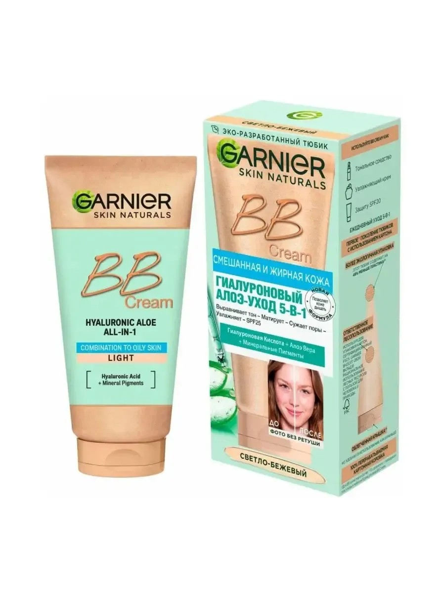 Garnier, BB Крем Гиалуроновый Алоэ-уход 5-в-1, для смешанной и жирной кожи, с гиалуроновой кислотой, алоэ вера и минеральными пигментами, матирующий, SPF 25, Светло-бежевый 50 мл. Легкая текстура создает ощущение комфорта и позволяет коже дышать. Формула обогащена: