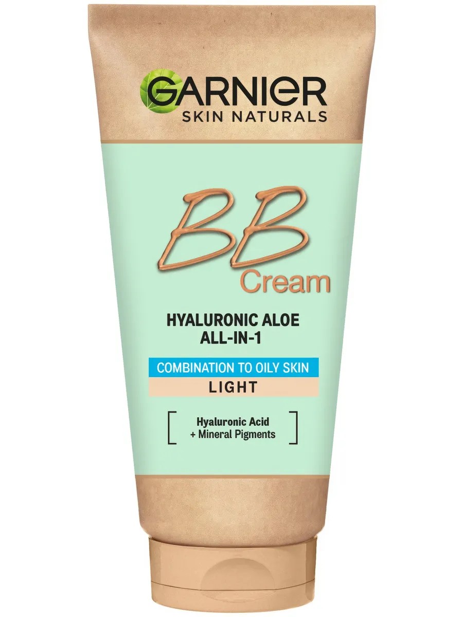 Garnier Skins Naturals BB Cream Hyaluronic Aloe-Care 5 in 1 for combination to oily skin, SPF 25, light beige, 50 ml. Our new formula from Garnier. The light texture creates a feeling of comfort and allows the skin to breathe. The formula is enriched with: Hyaluronic acid for intense hydration, Aloe vera extract for softening and greater comfort, Ultra-fine mineral pigments for a natural and radiant result. Use BB cream as a foundation, moisturizer, SPF 25 protection. Proven effectiveness of BB cream: Instantly evens out skin tone, Mattifies, Pores are less visible, Skin is visibly hydrated, SPF 25 protection from UV rays. How to use: Apply BB cream daily to clean skin of the face as you would a regular moisturizer. For more coverage, reapply the cream. Use sunscreen during prolonged sun exposure. Composition: AQUA/WATER, DIMETHICONE, ALCOHOL DENAT., TITANIUM DIOXIDE [NANO]/TITANIUM DIOXIDE, BUTYLENE GLYCOL, ISODODECANE, PEG-10 DIMETHICONE, PHENYL TRIMETHICONE, BIS-PEG/PPG-14/14 DIMETHICONE, SQUALANE, SYNTHETIC FLUORPHLOGOPITE, PARFUM/FRAGRANCE, MAGNESIUM SULFATE, ALUMINUM HYDROXIDE, STEARIC ACID, MALTITOL, TOCOPHERYL ACETATE, DISODIUM STEAROYL GLUTAMATE, ALOE BARBADENSIS LEAF JUICE POWDER, ASCORBYL GLUCOSIDE, CITRUS GRANDIS FRUIT WATER/GRAPEFRUIT FRUIT WATER, LINALOOL, BENZYL SALICYLATE, LIMONENE, BENZYL ALCOHOL, SORBITOL, SODIUM HYALURONATE, PERLITE, GERANIOL, CITRAL, TOCOPHEROL, [+/- MAY CONTAIN CI 77891/TITANIUM DIOXIDE CI 77491, CI 77492, CI 77499/IRON OXIDES] (FIL B272005/1).