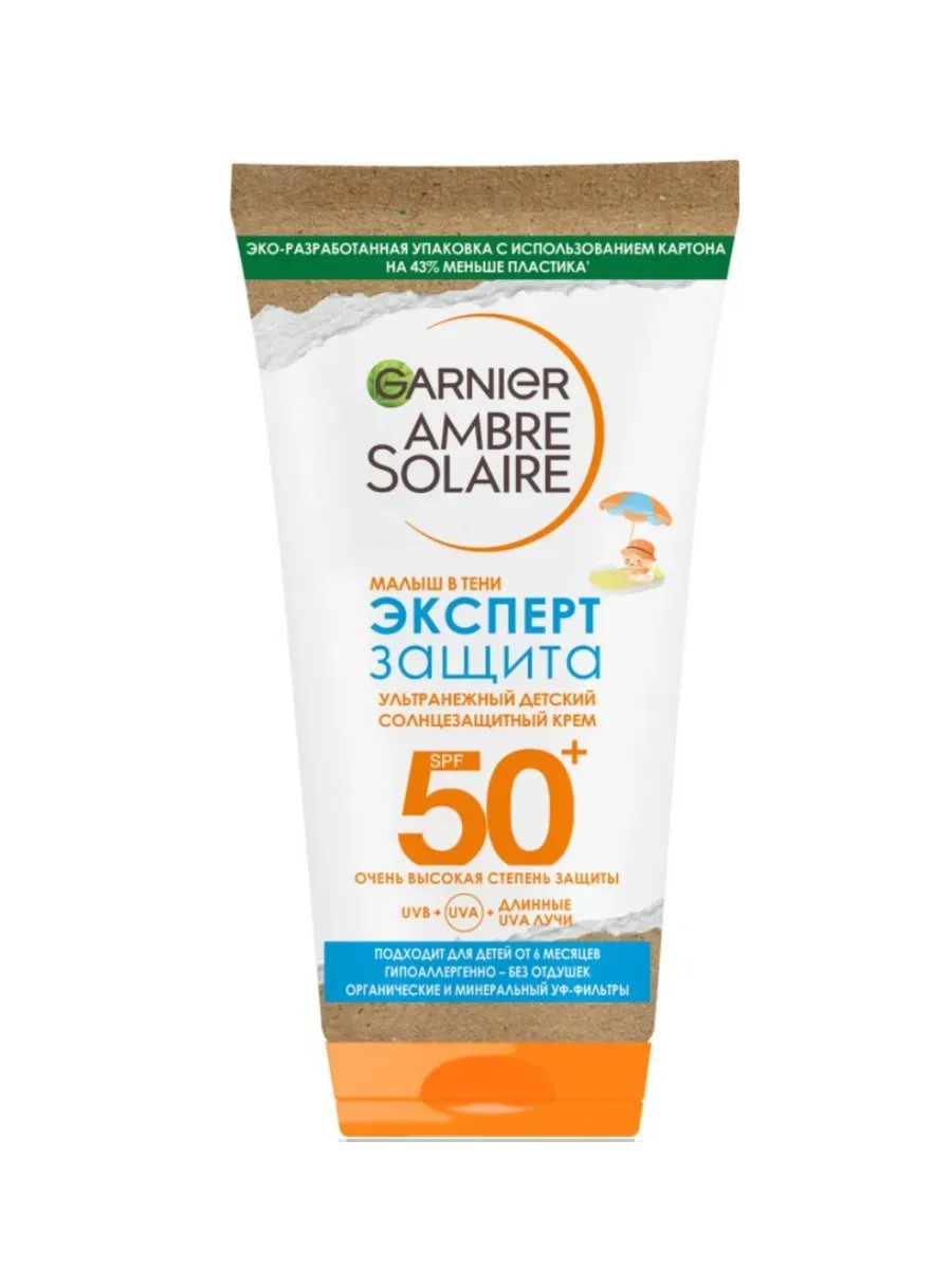 GARNIER Children's Sunscreen Body Cream + 50 SPF, 50 ml. Ultra-gentle sunscreen. Ambre Solaire recommends keeping children under an umbrella to avoid direct sunlight. But even in the shade, your baby is not fully protected, as they are exposed to indirect sunlight reflected off water, grass, and sand. Therefore, your baby needs reliable protection: Protecting delicate baby skin from long UVA rays. UVA rays are the most dangerous, as they penetrate deeper into the skin and imperceptibly negatively affect it.