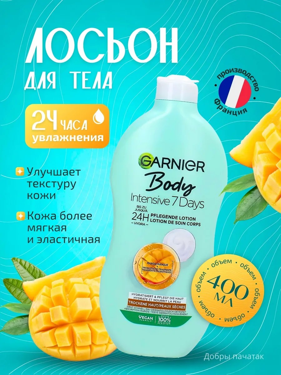 Лосьон для тела Body Intensive 7 Days от GARNIER обеспечивает сухую и грубую кожу интенсивным и длительным увлажнением. Обогащенная пробиотическим экстрактом и маслом манго, формула поддерживает защитный барьер вашей кожи и делает ее мягкой и эластичной. Молочко для тела быстро впитывается, нежирное и оставляет на коже ощущение ухоженности на долгое время.
