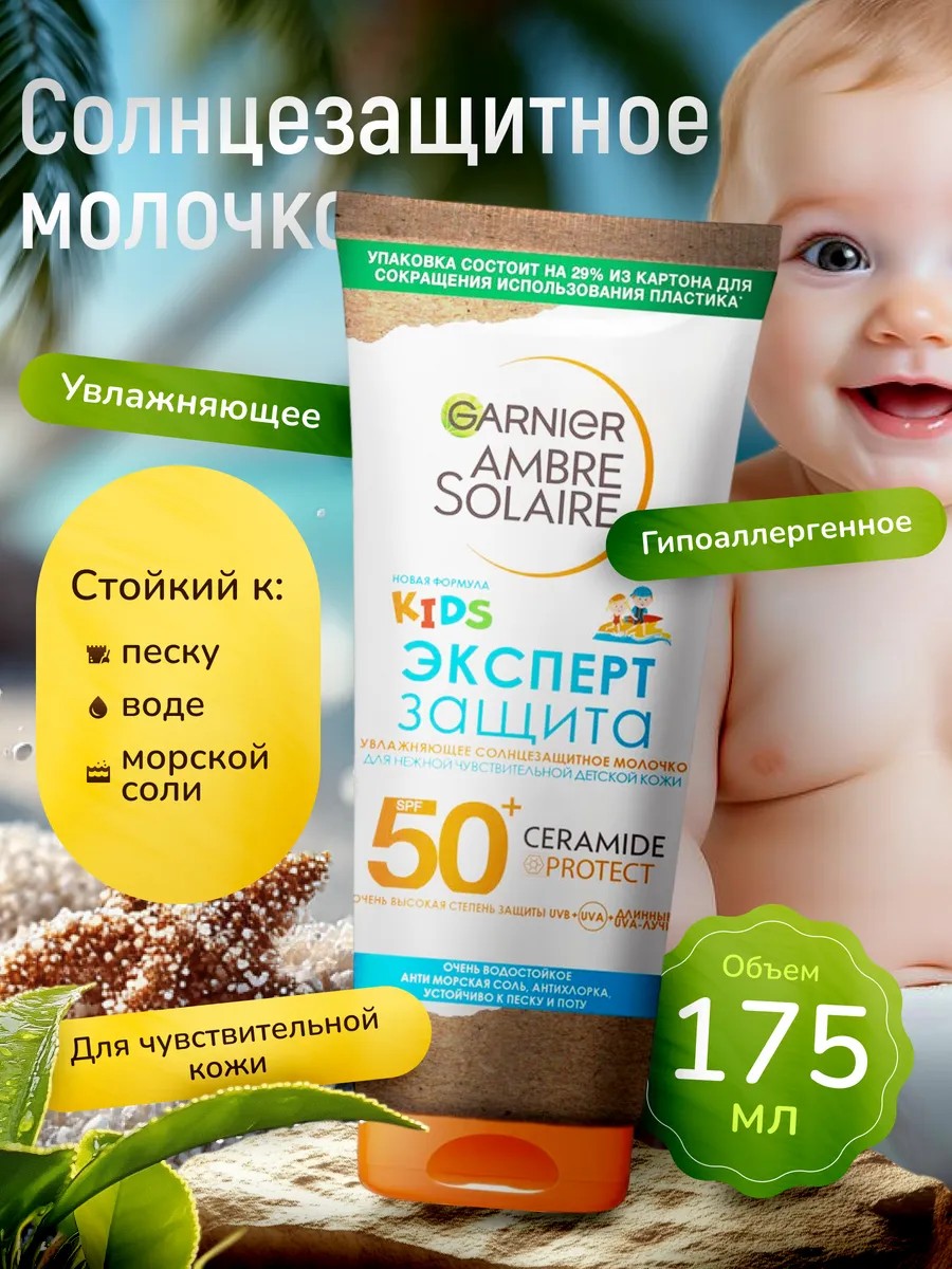Солнцезащитное молочко для детей Garnier Ambre Solaire KIDS Эксперт Защита SPF50+ 175 мл максимальная защита для нежной кожи. Защитите кожу вашего ребенка от агрессивного солнца с детским антизагарным кремом блок sunscreen от Гарньер. Это гипоаллергенное средство с максимальной степенью защиты от UVA и UVB-лучей создано специально для чувствительной детской кожи, включая новорожденных, младенцев от 0+, детей от 1+, подростков и взрослых. Водостойкая формула и большой объем солнцезащиты идеально подходит для пляжа, моря и активного отдыха, устойчива к воде, песку и поту. Высокий СПФ 50+ блокирует более 99% вредного излучения, предотвращая ожоги, пигментацию, покраснения и появление пигментных пятен. Крем барьер полный блок предотвращает сухость, быстро впитывается, не оставляет липкости. Наносите увлажняющий санскрин от загара равномерно на все тело, лицо, руки, ноги, шею, нос за 15–20 минут до выхода на солнце каждый день. Обновляйте анти загар каждые 2 часа и после купания. Безопасный состав не содержит отдушек и подходит для всей семьи.