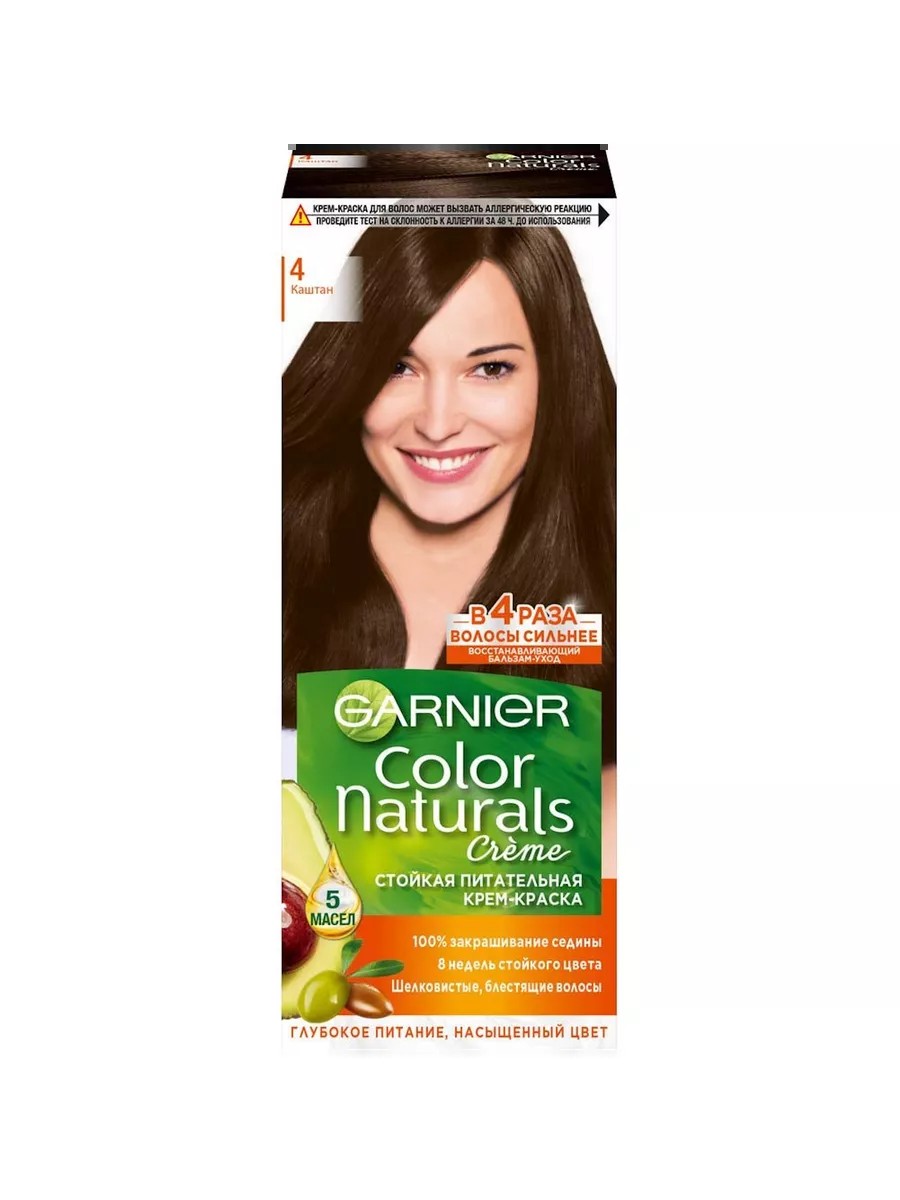 крем-краска Garnier Color Naturals 4 «Каштан» не просто покрывает волосы, а проникает в кутикулы, активно увлажняя и питая их. Многочисленные масла, богатые жирными кислотами и витаминами, в составе формулы обеспечивают эффективный комплексный уход: укрепление, защиту от внешних воздействий, предотвращение сечения волос и возвращение им блеска. Оттенок 4 «Каштан» отлично справляется с задачей закрашивания седины и сохраняется на волосах до 8 недель, не теряя насыщенности.