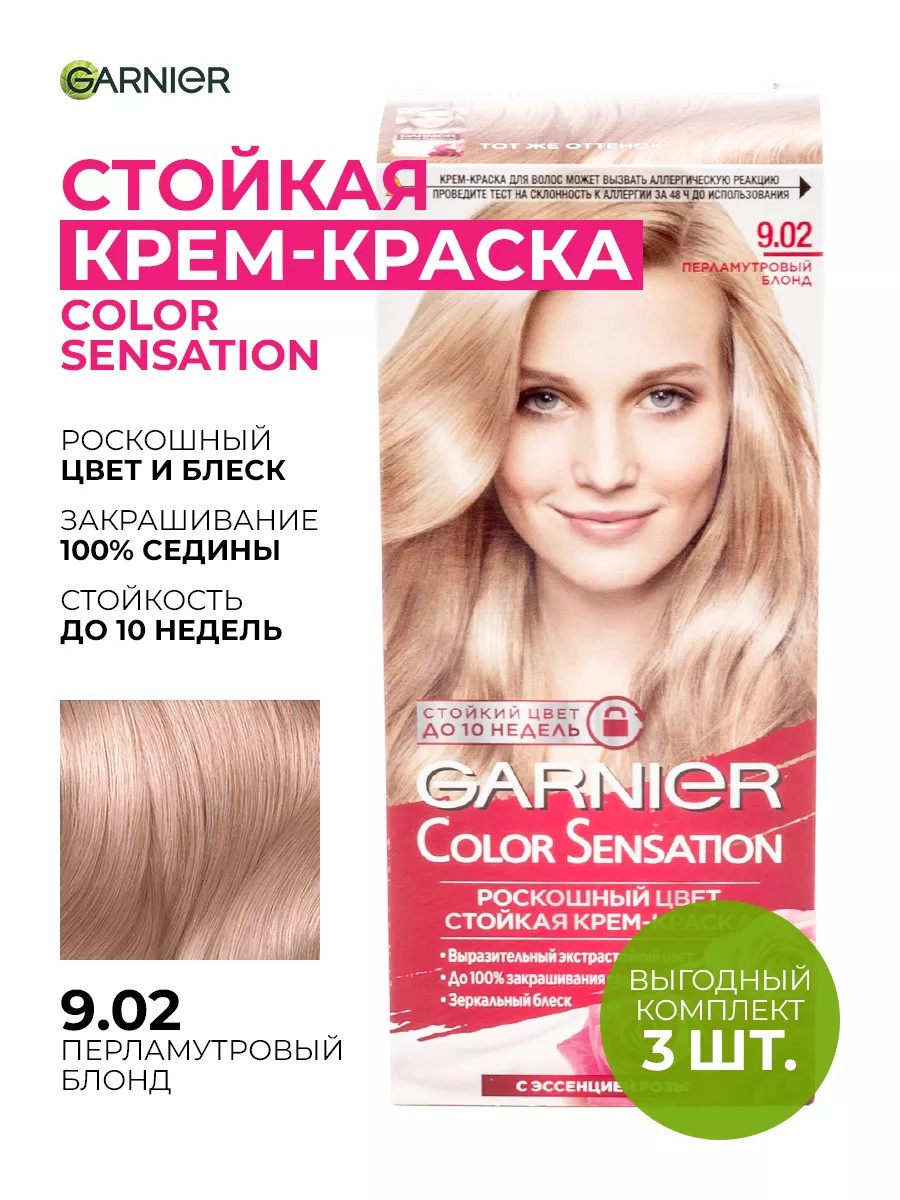 Garnier / Гарньер Color Sensation Крем-краска для волос стойкая тон 9.02 перламутровый блонд с маслом дикой розы 112мл / уход за волосами. Комплект состоит из 3 шт. Цена за комплект. Каждая женщина хочет выглядеть сногсшибательно! Окрашивание волос превращается в настоящую процедуру ухода, сравнимую с оздоровлением волос в салоне красоты. Перламутровые частицы входящие в состав стойкой краски для волос Garnier Color Sensation с аммиаком отражают цвет и придают волосам зеркальный блеск. Стойкая крем-краска для волос - создает ровное покрытие и яркий блеск! Формула включает масло дикой розы, которое успокаивает кожу головы во время окрашивания, смягчает и увлажняет волосы, придает им шелковистость. Сохранить и усилить эффект шелковых и гладких волос после окрашивания позволит использование бальзама для волос, который придаст вашим волосам мягкость, блеск и шелковистость! краска для волос гарньер / уход за волосами / средство для волос Состав: Aqua, Paraffinum Liquidum / Mineral Oil, Cetearyl Alcohol, Ethanolamine, Steareth-20, Ammonium Hydroxide, Steareth-2, 4-Amino-2-Hydroxytoluene, M-Aminophenol, Tocopherol, Sodium Metabisulfite, Thioglycerin, Polyquaternium-6, Toluene-2,5-Diamine, Camellia Oleifera Seed Oil, Resorcinol, Edta, Erythorbic Acid, Parfum / Fragrance (F.I.L. C218218/1).