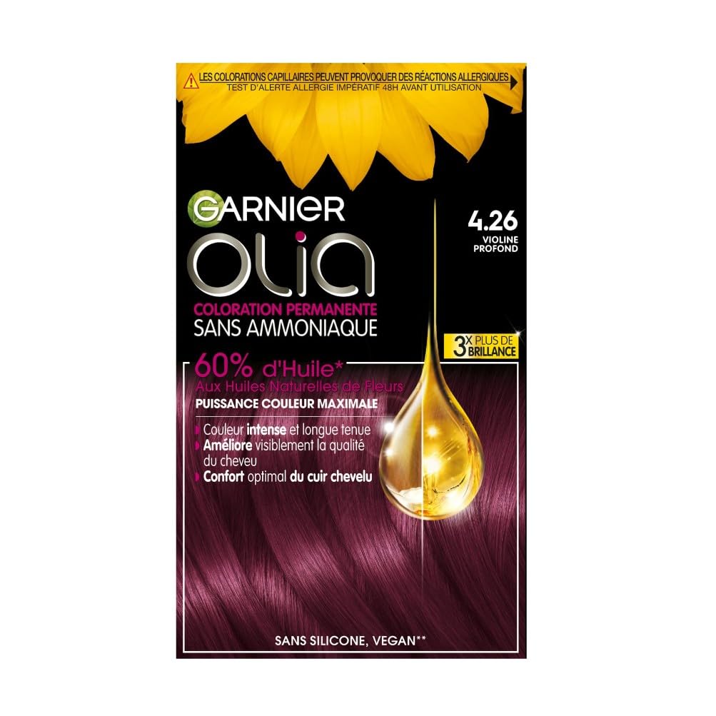 : Discover Garnier's Olia, the first ammonia-free permanent hair color activated by oil. With its ODS technology and 60 oil content, Olia visibly improves hair quality, color after color. Thanks to its maximum color intensity, Olia offers long-lasting, rich, and vibrant color. Its wide range of shades will satisfy all your color desires while preserving the health of your hair. With Olia, enjoy a truly pleasurable coloring experience: appreciate the velvety texture of the color cream and developer mixture savor its delicate floral fragrance during application and extend this experience by reusing the shine and silky-touch conditioner after coloring. Ingredients 1180929 Coloring cream: PARAFFINUMLIQUIDUM MINERALOIL•AQUA WATER•ETHANOLAMINE•STEARETH-20•CAPRYLYL CAPRYL GLUCOSIDE • POLYSORBATE 21 • STEARETH-2 • 4-AMINO-2-HYDROXYTOLUENE • ASCORBICACID • TOCOPHEROL • SODIUMMETABISULFITE • HYDROXYETHOXYAMINOPYRAZOLOPYRIDINE HCL • SODIUMACETATE • SODIUM CHLORIDE • THIOGLYCERIN • TOLUENE-2,5-DIAMINE • POLYQUATERNIUM-67 • HELIANTHUS ANNUUS SEEDOIL SUNFLOWERSEEDOIL•2-METHYL-5-HYDROXYETHYLAMINOPHENOL•LIMNANTHESALBASEEDOIL MEADOWFOAM SEED OIL • CAMELLIA OLEIFER SEED OIL • N,N-BIS(2-HYDROXYETHYL)-p-PHENYLENEDIAMINESULFATE • ISOPROPYL ALCOHOL • PASSIFLORA INCARNATA SEED OIL • EDTA • PARFUM FRAGRANCE (F.I.L. C213944 1). P.when('A').execute(function(A) { A.on('a:expander:toggle_description:toggle:collapse', function(data) { window.scroll(0, data.expander. expander[0].offsetTop-100) }) }) Directions for use: Perform an allergy test 48 hours before use. Read the instructions carefully before each use. Recommended quantity: 1 box (medium-length hair), 2 boxes (long hair). Apply the color cream and developer lotion, then leave on for the recommended time. Rinse thoroughly and follow with the care and instructions provided. See moreContents: 1x Garnier Olia Permanent Hair Color Box, Deep Violet (4.26), Includes: gloves, applicator bottle, developer lotion, coloring cream, conditioner, and instructions for use. Velvety, non-drip cream formulated without ammonia for a light and pleasant floral fragrance during application. O.D.S. Technology, composed of 60 oil, propels color deep into the hair shaft. Directions for use: Perform an allergy test 48 hours before application. Read the instructions carefully before each application. Recommended quantity: 1 box (medium-length hair), 2 boxes (long hair). Results: Light, nourished hair protected against dryness. A multitude of highlights. Intense and even color. Permanent hair color with natural flower oils for a deep, long-lasting violet shade. Visibly improved hair quality and optimal scalp comfort.Description du produit Découvrez Olia de Garnier, la 1ère coloration permanente sans ammoniaque activée par l'huile. Avec sa technologie ODS, 60 d'huile, Olia améliore visiblement la qualité du cheveu, coloration après coloration. Grâce à une puissance couleur maximale, Olia vous offre une couleur longue tenue, riche et vivante. Sa large palette de nuances répondra à toutes vos envies de couleurs, tout en préservant la qualité de vos cheveux. Avec Olia, profitez d'un véritable moment de plaisir pendant votre coloration : appréciez la texture veloutée du mélange de la crème colorante et de la crème révélatrice savourez son délicat parfum floral pendant l'application et prolongez cette expérience en réutilisant après la coloration, le soin brillance toucher soie. Ingrédients 1180929 Crème colorante : PARAFFINUMLIQUIDUM MINERALOIL•AQUA WATER•ETHANOLAMINE•STEARETH-20•CAPRYLYL CAPRYL GLUCOSIDE • POLYSORBATE 21 • STEARETH-2 • 4-AMINO-2-HYDROXYTOLUENE • ASCORBICACID • TOCOPHEROL • SODIUMMETABISULFITE • HYDROXYETHOXYAMINOPYRAZOLOPYRIDINE HCL • SODIUMACETATE • SODIUM CHLORIDE • THIOGLYCERIN • TOLUENE-2,5-DIAMINE • POLYQUATERNIUM-67 • HELIANTHUS ANNUUS SEEDOIL SUNFLOWERSEEDOIL•2-METHYL-5-HYDROXYETHYLAMINOPHENOL•LIMNANTHESALBASEEDOIL MEADOWFOAM SEEDOIL•CAMELLIAOLEIFERASEEDOIL•N,N-BIS(2-HYDROXYETHYL)-p-PHENYLENEDIAMINESULFATE•ISOPROPYL ALCOHOL • PASSIFLORA INCARNATA SEED OIL • EDTA • PARFUM FRAGRANCE (F.I.L. C213944 1). P.when('A').execute(function(A) { A.on('a:expander:toggle_description:toggle:collapse', function(data) { window.scroll(0, data.expander. expander[0].offsetTop-100) }) }) Mode d'emploi Effectuez un test d'allergie 48 heures avant utilisation. Lisez attentivement les instructions avant chaque utilisation. Quantité recommandée : 1 boîte (cheveux de longueur moyenne), 2 boîtes (cheveux longs). Appliquez la crème colorée et le lait révélateur, puis laissez agir pendant le temps recommandé. Rincez abondamment et suivez avec les soins et les instructions fournis. Voir plusContenu : 1x Boîte de coloration permanente Garnier Olia, Violine Profond (4.26), Inclus : gants, bouillote, lait révélateur, crème colorante, soin et notice d'utilisation. Crème veloutée sans coulure et formulée sans ammoniaque pour un parfum floral léger et agréable à l'application, Technologie O.D.S composée à 60 d'huile pour propulser la couleur au cœur du cheveu. Conseils d'utilisation : Réaliser un test d'allergie au préalable 48h avant application, Lire attentivement la notice avant toute application, Quantité recommandée : 1 boîte (cheveux mi-longs), 2 boîtes (cheveux longs). Résultats : Des cheveux légers, nourris et protégés contre le dessèchement, Multitude de reflets, Couleur intense et uniforme. Coloration permanente aux huiles naturelles de fleurs pour un violine profond et longue tenue, Qualité du cheveu visiblement améliorée et confort optimal du cuir chevelu.Garnier Coloration Permanente - Sans Ammoniaque - Aux Huiles Naturelles de Fleurs - Violine Profond (4.26) - Olia Vivids VIOLINE PROFOND 4.26