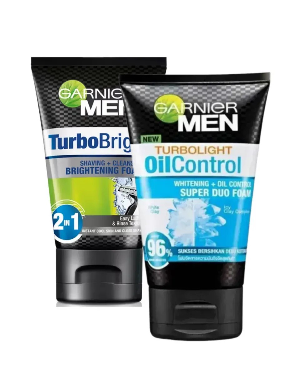 It includes the innovative Garnier Men Turbolight Oil Control face wash and Garnier Men Turbo Bright 2in1 Shaving + Cleansing Brightening Foam shaving cream, providing comprehensive and effective care.