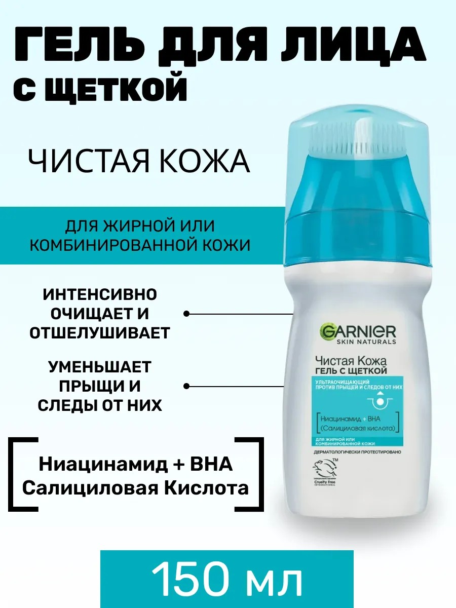 Гель с щеткой GARNIER Skin Naturals Чистая кожа Ультраочищающий против прыщий и следов от прыщей 150 мл
