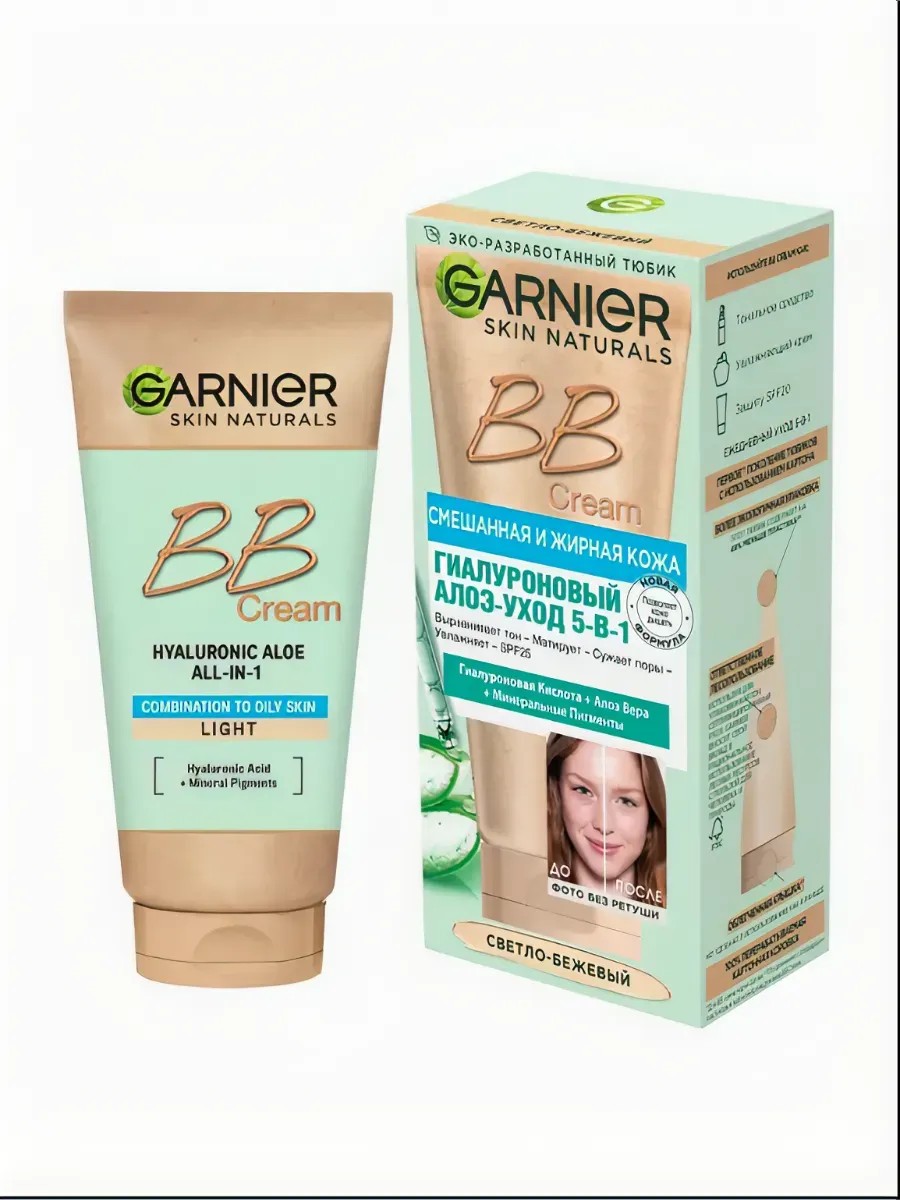 Гарнер BB Крем "Гиалуроновый Алоэ-уход 5-в-1", для смешанной и жирной кожи, натурально-бежевый, матирующий, SPF 25. СПОСОБ ПРИМЕНЕНИЯ: Ежедневно наносите BB cream на чистую кожу лица так же, как обычный увлажняющий крем. Для более плотного покрытия нанесите крем повторно. Доказанная эффективность BB cream: Мгновенно выравнивает тон кожи лица, Матирует, Поры менее заметны, Кожа заметно увлажнена, защита SPF25 от ультрафиолетовых лучей. При длительном пребывании на солнце используйте солнцезащитные средства.