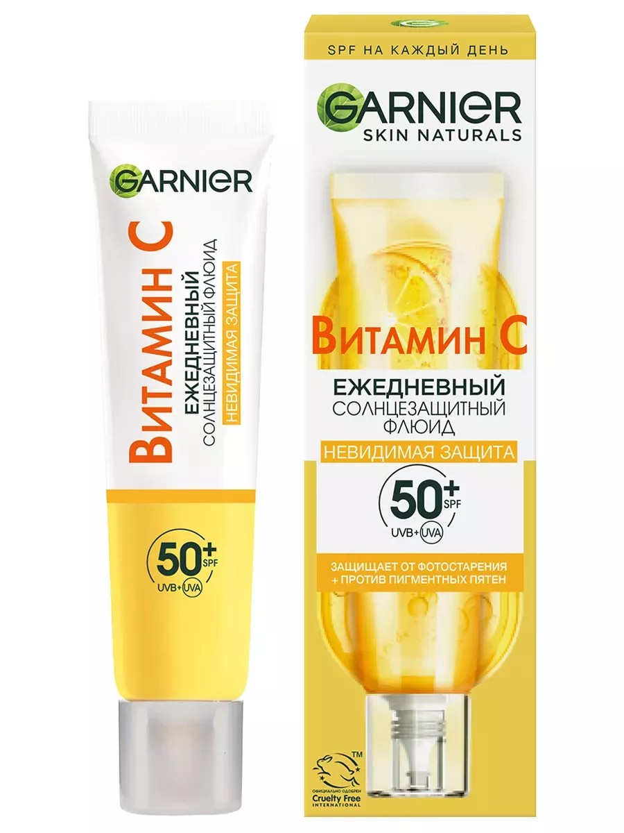 Garnier Skin Naturals Витамин С Флюид солнцезащитный Невидимая защита 40мл. Солнцезащитный флюид с невесомой текстурой, обогащен Витамином С* в сочетании с очень высокой степенью защиты от солнца SPF 50+ (СПФ 50) и минеральными пигментами, придает сияние, скрывает несовершенства, выравнивает тон и интенсивно увлажняет.