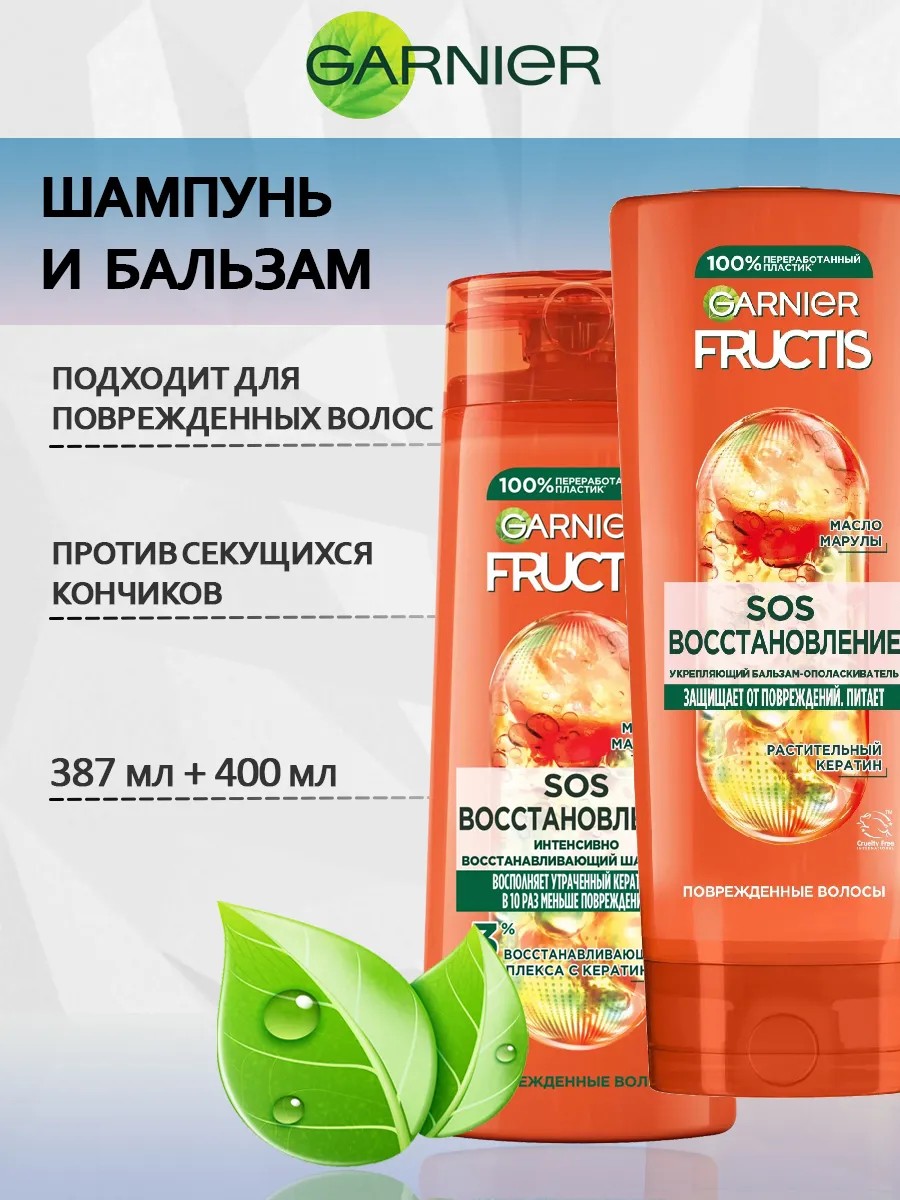 Поврежденные ломкие волосы? Шампунь Fructis представляет систему восстановления волос, которая совмещает в себе суперфрукт натурального происхождения с активными ингредиентами. Бальзам-Ополаскиватель и Шампунь для волос SOS Восстановление обогащен двумя суперингредиентами: Формула с маслом амлы и кератином питает и укрепляет поверхность волос по всей длине, а также восстанавливает повреждения волос, вызванные внешними воздействиями (сушка феном, тепловая укладка). Доказано! Волосы выглядят более здоровыми, шелковистыми и блестящими. Способ применения: После использования шампуня нанесите на влажные волосы по всей длине, избегая корней. Оставьте на 2-3 минуты, затем смойте. 1. Устраняет 1 год повреждений за 3 применения. 2. Питает и укрепляет поверхность волос. 3. Восстанавливает повреждения. 4. Волосы более здоровые шелковистые и блестящие. 5. Без парабенов. В упаковке 2 флакона: Шампунь 400 мл и бальзам 387 мл. Всего 787 мл.