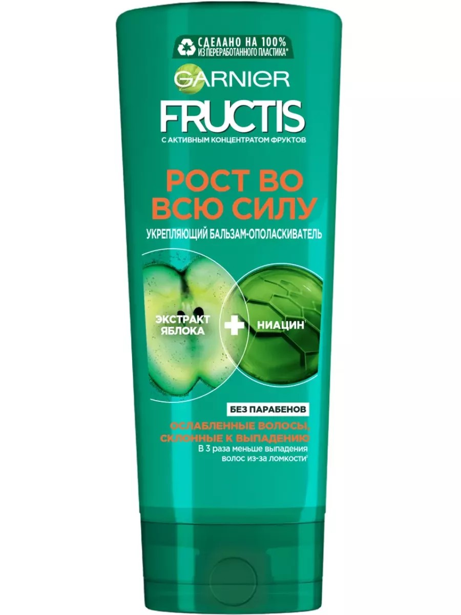 СЛАБЫЕ, ХРУПКИЕ ВОЛОСЫ? Fructis (Фруктис) от Garnier (Гарньер) представляет систему усиления, которая сочетает в себе суперфрукт натурального происхождения с активными ингредиентами. Ваши волосы выглядят более здоровыми и сильными. Бальзам-ополаскиватель Рост Во Всю Силу обогащен двумя суперингредиентами: