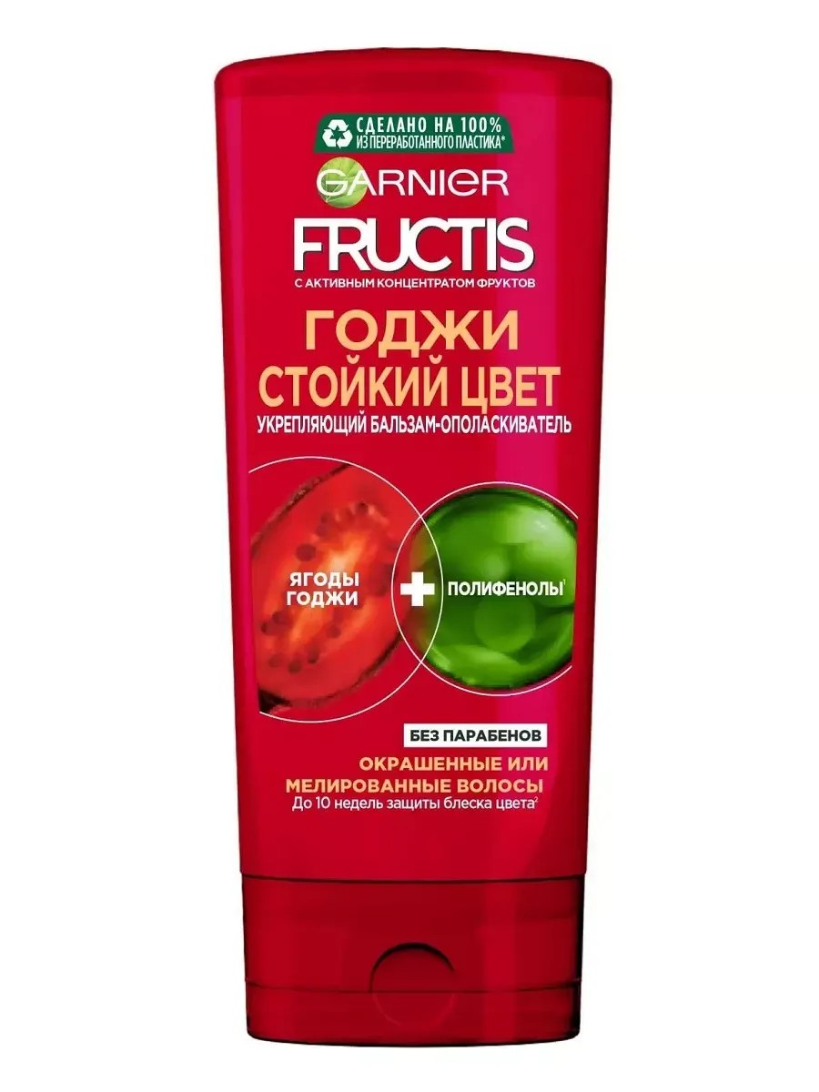 Новая формула Fructis не содержит парабенов и обогащена активным концентратом фруктов. Благодаря комбинации фруктов, витаминов В3, В6 и протеина лимона волосы более сильные и блестящие. Уникальная формула Fructis «Годжи: стойкий цвет», обогащённая ягодами годжи и полифенолами, питает и придаёт блеск окрашенным волосам, обеспечивая до 10 недель защиты блеска окрашенных волос. Fructis эффективно и бережно ухаживает за волосами. Подходит для ежедневного применения.