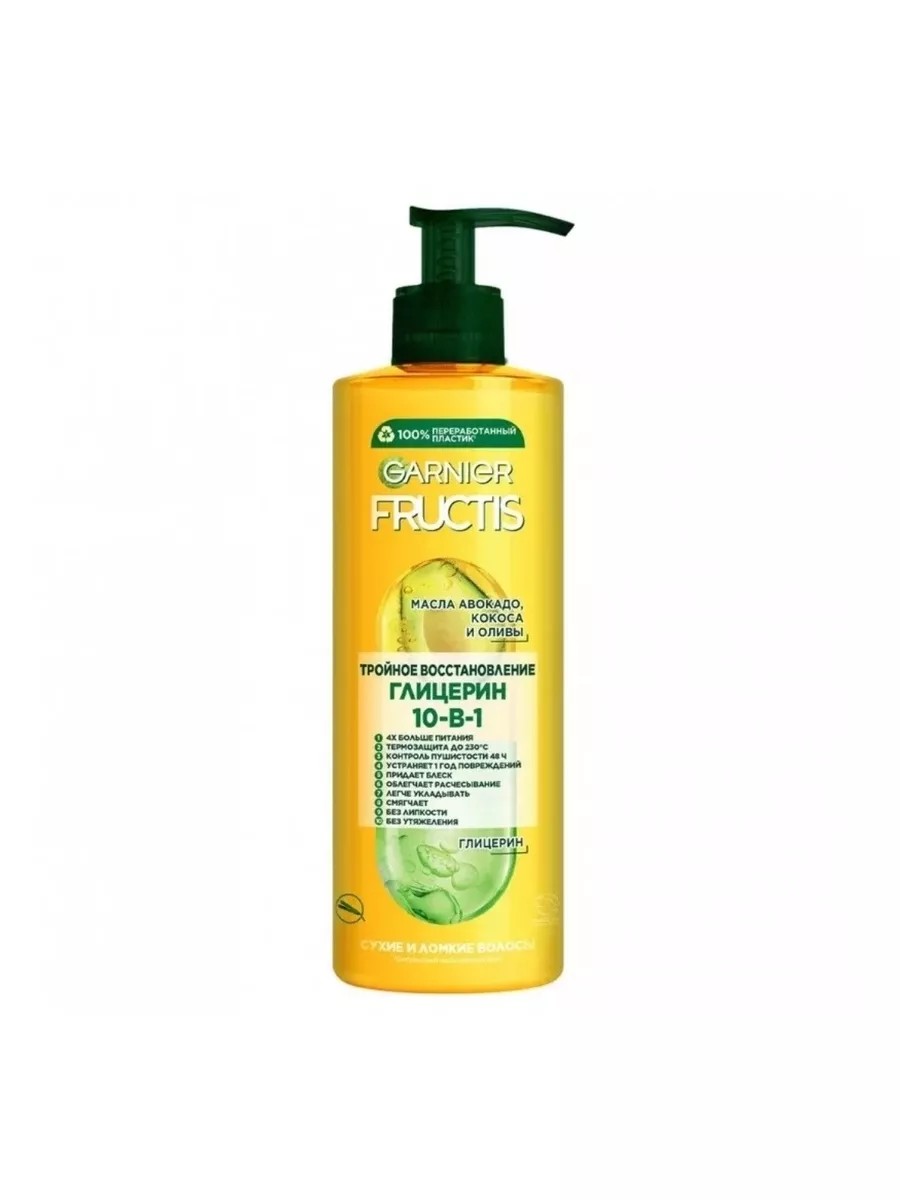 10-in-1 solution for dry hair from Garnier - Garnier. The light texture of the complex leave-in cream from Fructis - Fructis, enriched with avocado, coconut, olive oils and nourishing lipids, nourishes hair and protects it from everyday damage caused by combing, blow-drying and styling with hot tools. Result: Your hair is stronger, smoother and looks healthier. It is protected from thermal effects. Fructis formulas contain active fruit concentrates. An exclusive combination of plant extracts, lemon protein, fruits and vitamins B3 and B6. For strong and healthy-looking hair. The bottle is made from 100% recycled plastic. - Manufactured in a factory implementing a sustainable development program. - This bottle has a future, please recycle it. HOW TO USE: Apply to damp or dry hair, paying particular attention to the ends.